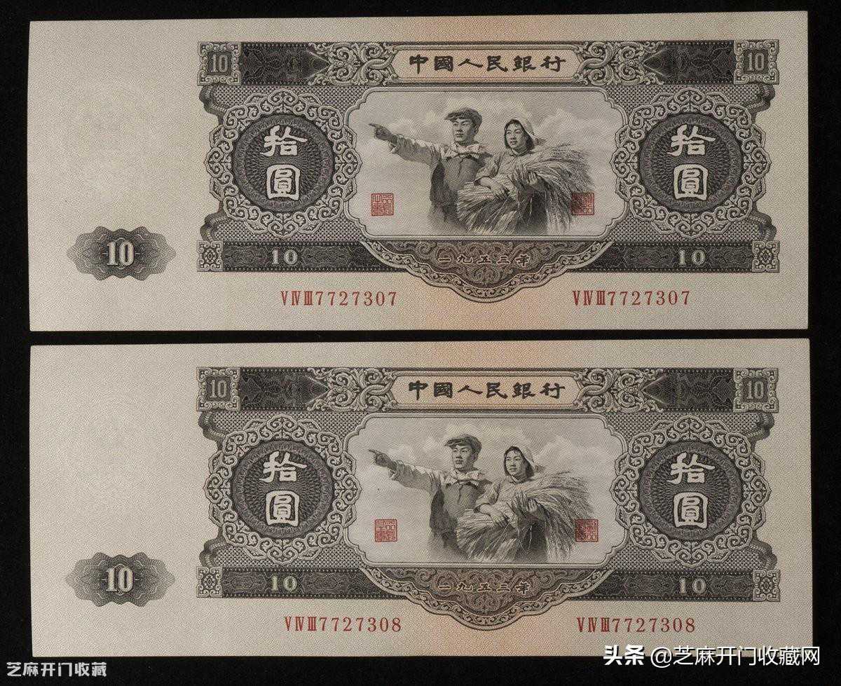 5:1953年第二版人民币拾圆连号二枚,两连号,7727307,7727308,九五品,估价:RMB200000,成交价RMB253000