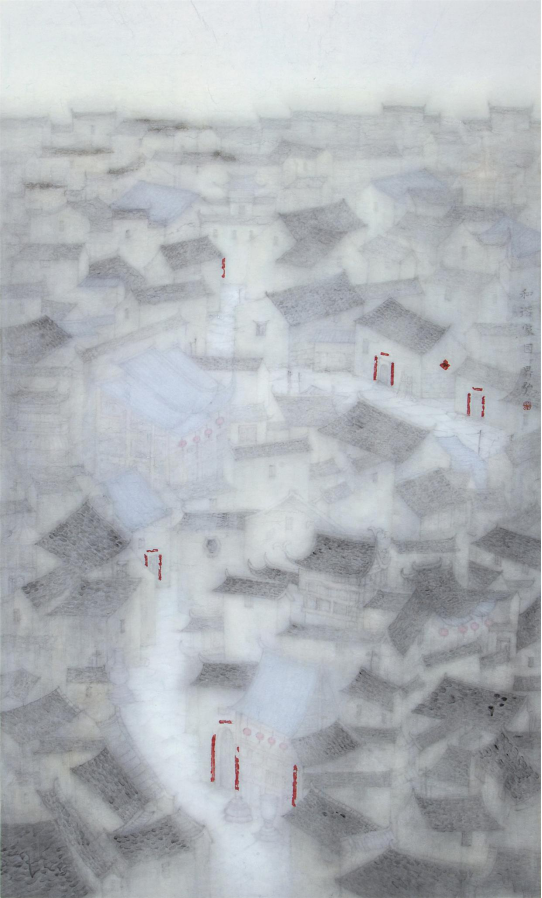 抬眼望,近处的瓦屋,远处的青山,层层叠叠、素素白白的一层,仿若旧地重游,找寻那模糊又熟悉的曾经。师界弘,是你笔下的杏花雪么,处处溢着悠悠暗香,梦里梦外分不明。这是怎样的你啊!