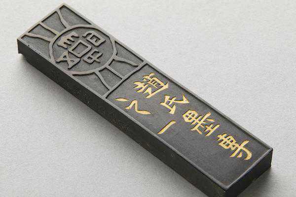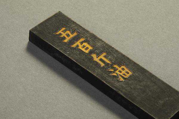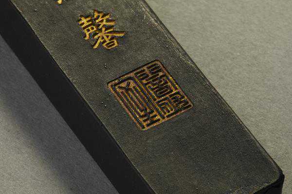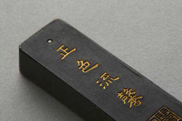 《四家藏墨图录》著录赤水珠墨一笏(今归故宫博物院),与此墨出于同一墨模。惟彼墨无磕碰而字口颜色已脱落,此则略有磕损而字口金蓝颜料痕迹尚在。墨面清灰而略泛蓝光,崩口黑而无光,松烟之制无疑。墨上镌刻刀工精熟,刀法圆润,已开清代精丽之风。吴元养名见清初孙承泽撰(传)《砚山斋杂记》:“延陵吴元养墨,篆书。崇祯年造,楷书。镇纸式。”知其制墨于崇祯年间。吴元养传世制品除前述镇纸式墨外,著录者仅见赤水珠墨一笏半,半笏藏于日本、一笏藏故宫博物院。“赤水珠”墨名当源于黄帝赤水遗玄珠之典故。此墨得于东瀛,深藏日本百余年,收藏者颇为珍视,以古锦为囊,贮存于紫铜鎏金墨盒内,故墨仅有些许磕碰伤。明代制品传至今日极为不易,大多残损或经使用,此则完璧,弥足珍贵。