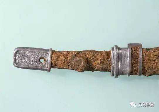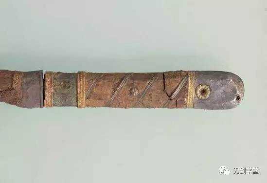 柄上点缀金质的卷花纹,同时还嵌了石榴石,柄首端有尖尖的凸起。