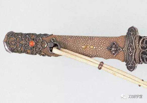 该刀装具为银制,柄首也为银制刻卷草纹以及鱼子地,上有一穿贯手绪的孔。