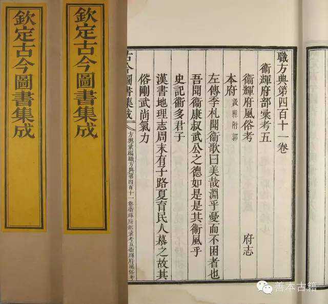 《古今图书集成》是康熙朝著名学者陈梦雷主持编纂的一部类书,全书分为六个汇编——《历象汇编》《方舆汇编》《明伦汇编》《博物汇编》《理学汇编》《经济汇编》,各汇编下又分若干部分,如《理学汇编》下有《经籍典》《学行典》《文学典》等。《古今图书集成》是我国现存规模最大的一部类书,所谓类书是将原书打散,再分门别类进行编纂,它与《四库全书》是不一样的,《四库全书》是丛书,原书的篇章结构是完整保存下来的。《古今图书集成》分散在不同单位保存,故宫图书馆存有一部,是原存天津蓟州盘山行宫静寄山庄的。