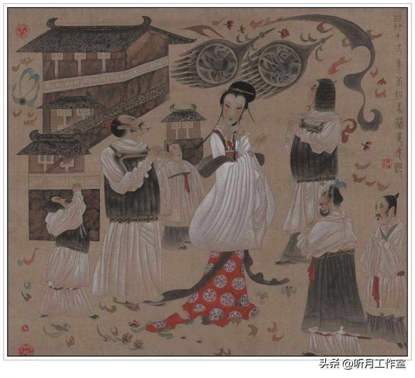 当代著名画家唐勇力《敦煌之梦》都市新民,纵130厘米横130厘米,2005年作。被中国美术馆收藏。此系列从1994年到2004年期间共创作60多幅,并获得全国工笔画大展银奖。参加“全国工笔画大展”,获银奖。系列作品参加《国画家》杂志举办的“中国画学术展”,获“国画家”奖。