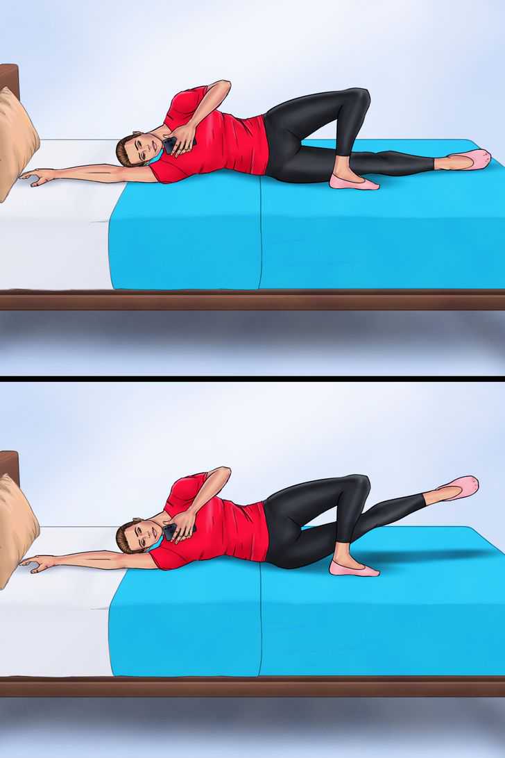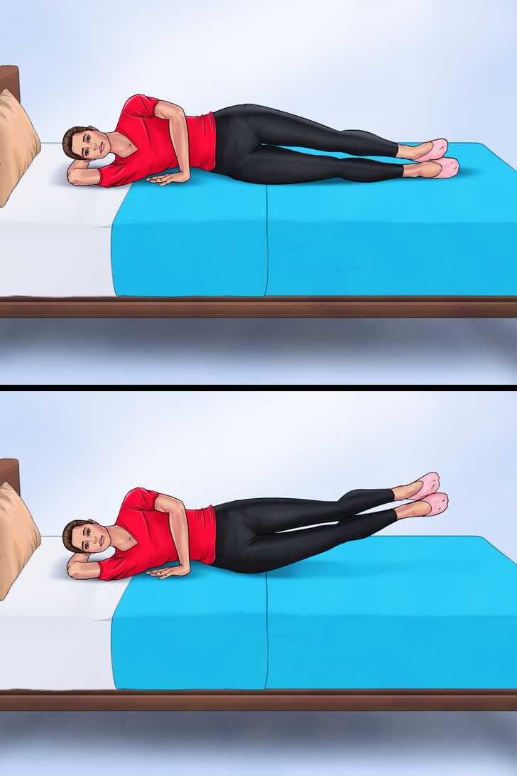侧卧双腿举高躺在一边,伸出你的下臂做支撑,并把你的脚叠起来。将你的大腿内侧和腿部挤压在一起,慢慢抬起。保持1-2秒,然后将腿放下,不接触床。每侧做2组,每组15次。
