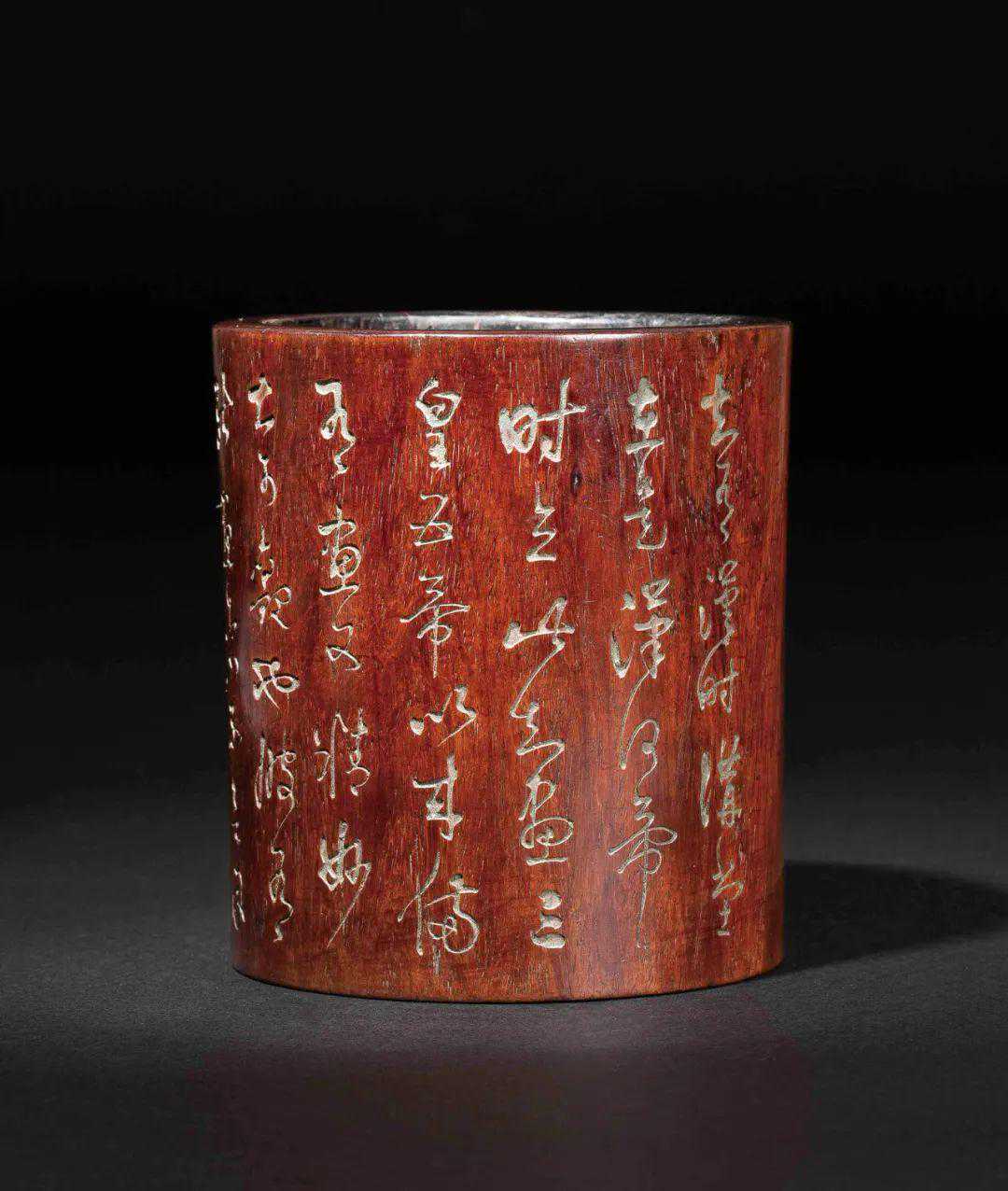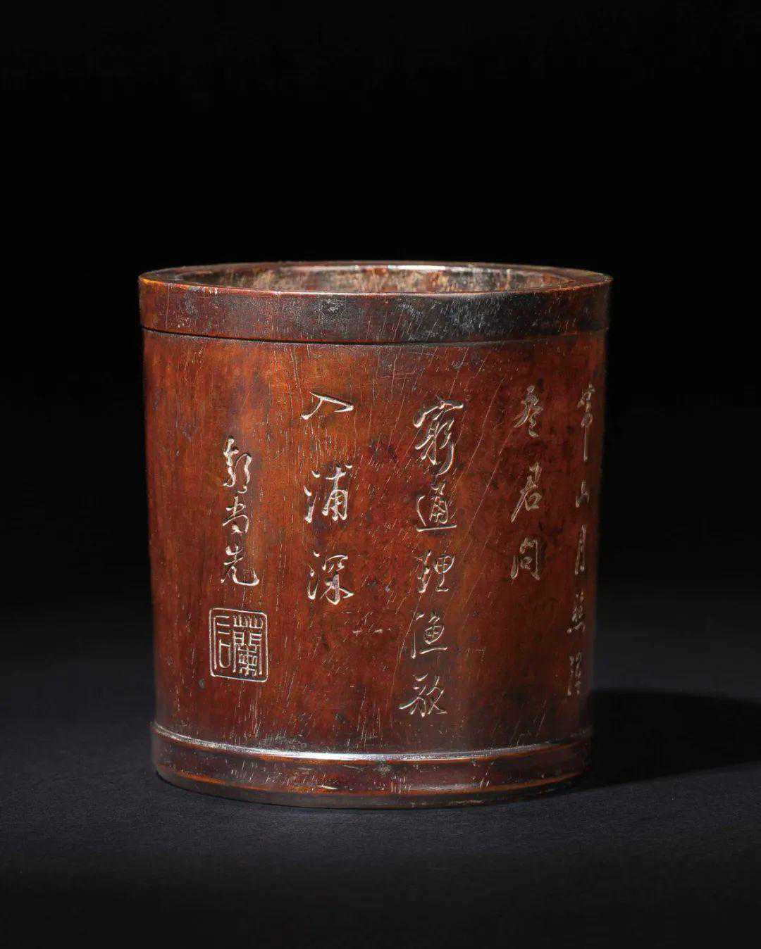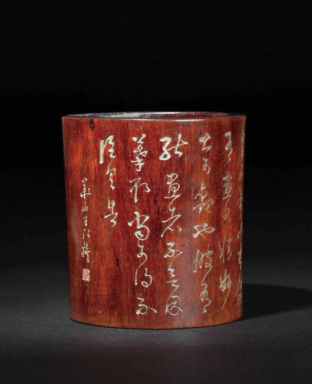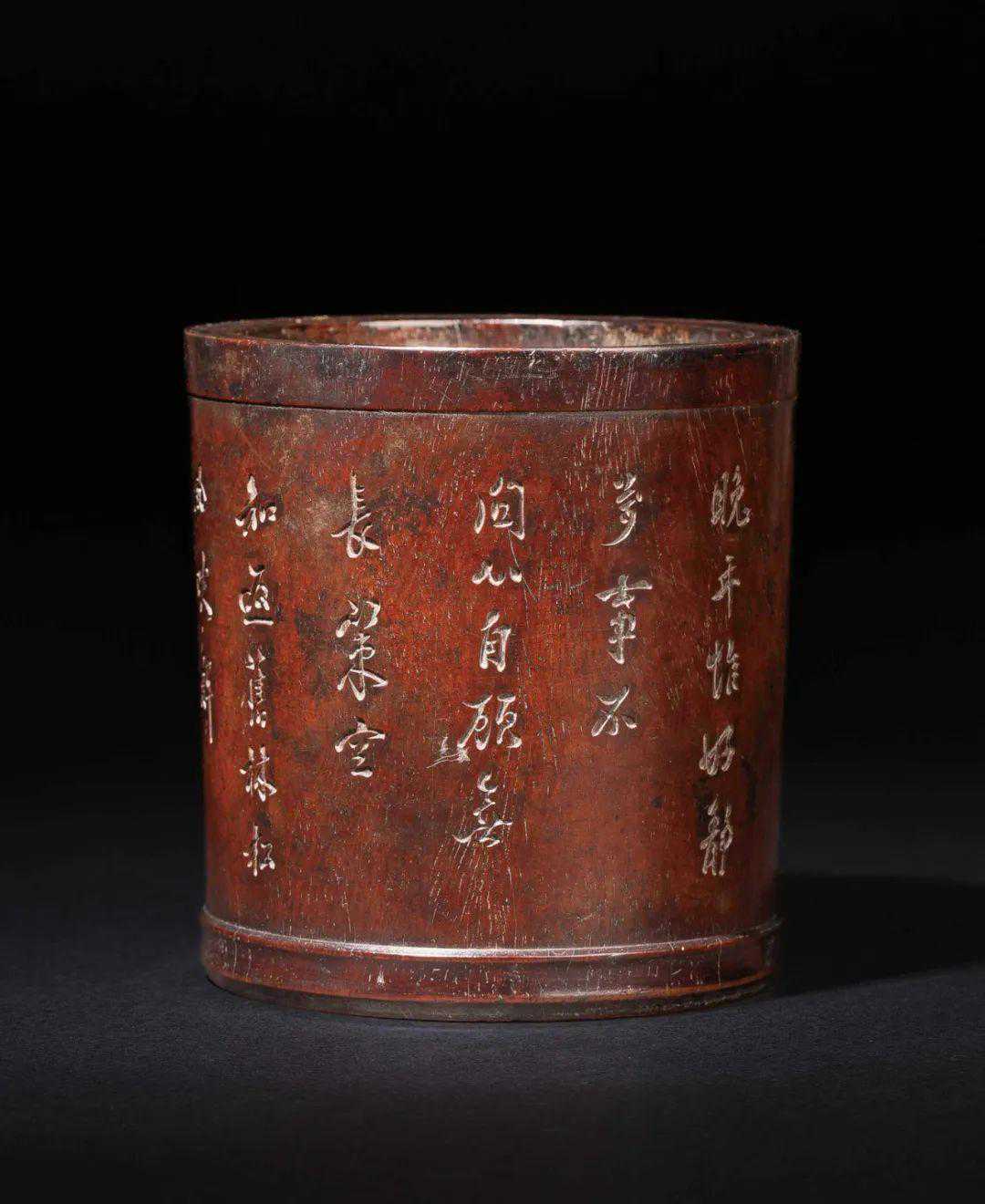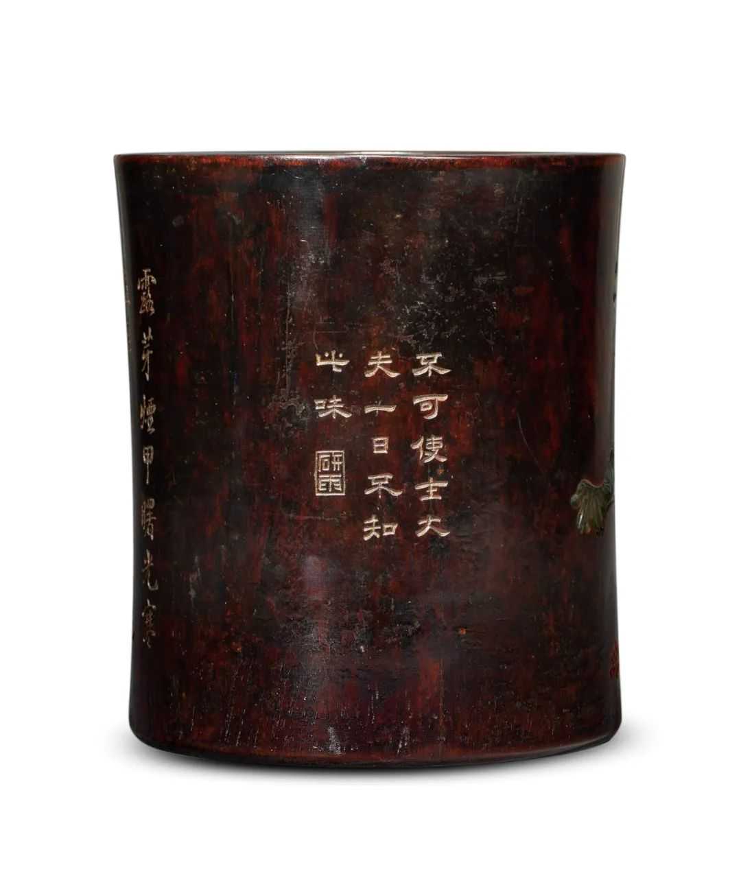 笔筒以黄花梨木精制而成,质地细腻珍贵,纹理清晰,葆光莹润,平口直壁,筒身上刻老梅一棵,梅干与梅枝以女字交错,纷而不乱;梅花姿态各异,自由向四方生长,似能闻得暗香巧来。制作者以刀代笔,表现出写意墨梅应有的书法线条,枝干之劲道,于飞白笔触中尽显。诗末落「松山制」,松山即为吴嵩山(一作松山),工画兼擅竹刻,竹刻师承周颢。周颢为乾隆年间嘉定地区的竹刻大师,开一代竹刻新风,影响清代竹艺深远。其重要贡献为,以阴刻模拟毛笔勾皴效果,力求用刀如用笔,赋予竹刻不同的书写性审美。此外,周颢还致力于竹面上模拟书画中的「南宗」文人画,使文人情怀与竹刻艺术交相辉映,开启嘉定竹刻艺术的新纪元。本笔筒之制作者吴嵩山,作为周颢之弟子,可谓清中期嘉定竹刻高潮期的代表人物之一,且因其本身善于书画,于竹刻上创作之文人画更显自然。