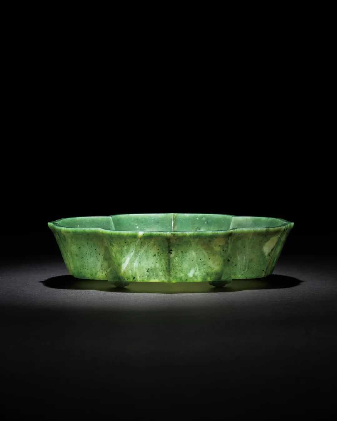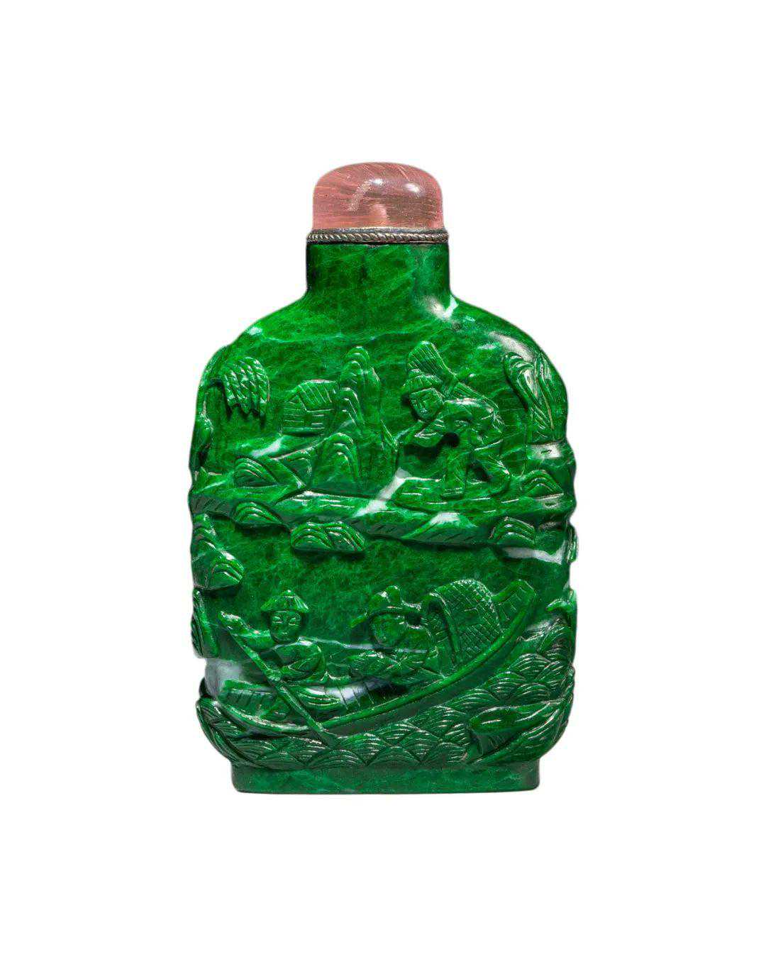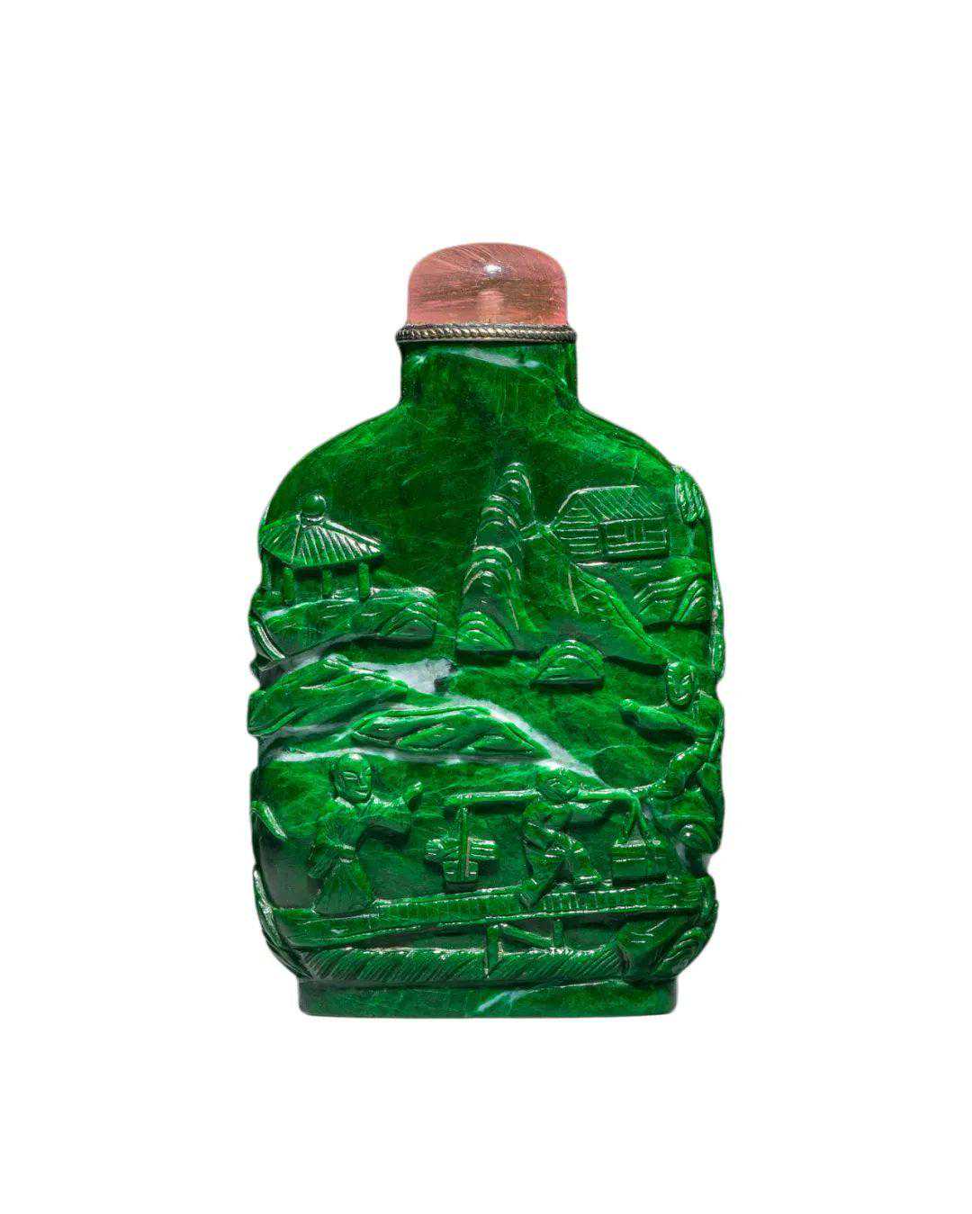 纪晓岚曾在《阅微草堂笔记》中写道:「云南翡翠玉,⋯⋯当时不以玉视之,⋯⋯今则为珍玩。盖相距五六十年,物价不同已如此,况隔越数百年矣。」从上述可知,翡翠于乾隆朝开始备受推崇与喜爱,变得十分珍贵。可回顾1990年香港苏富比,类似拍品,当年以天价473万元港币拍出,为史上最贵翡翠鼻烟壶,可资比较。
