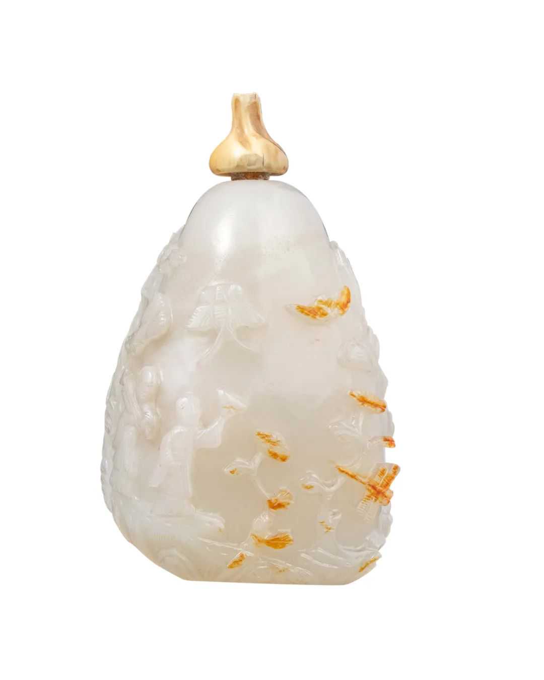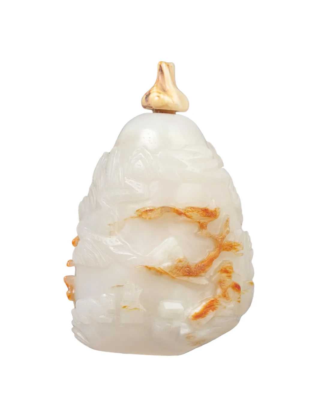 壶白玉质,似瓜形,天然玉皮,巧雕山峦、松树、人物、蝴蝶、蜻蜓,长者乘坐在松树下呈休息姿态,协旁的侍者成跪卧姿烹煮茶,利用玉皮巧雕松树、长者,独具匠人之巧思,彷佛在山峦中歇息品茶之场景。另一面雕刻花卉昆虫及携琴访友人物题材。苏作鼻烟壶精品表现向来不俗,2010年5月香港邦汉斯一件苏作白玉人物风景图鼻烟壶,曾以770,685美元成交,可资比较。
