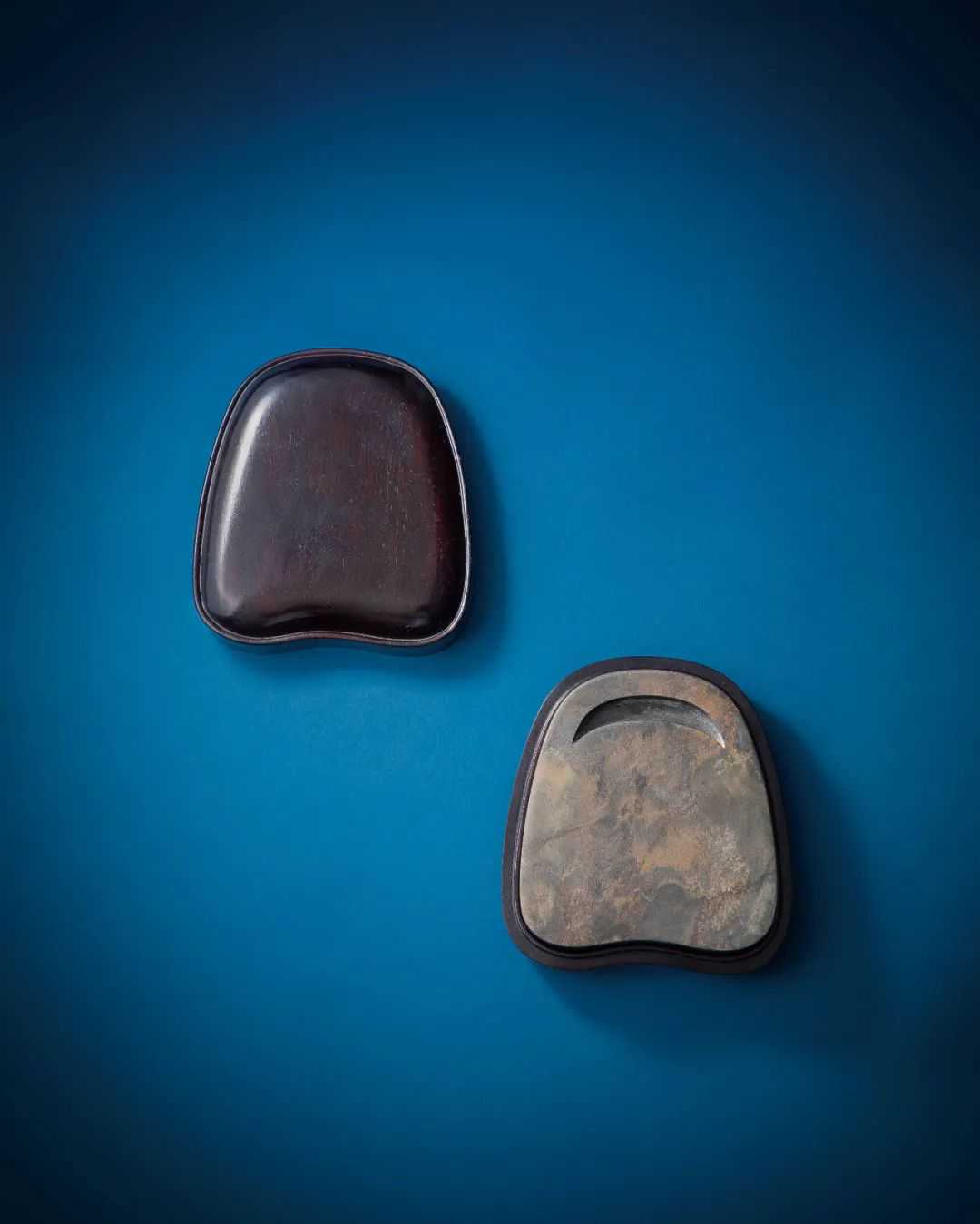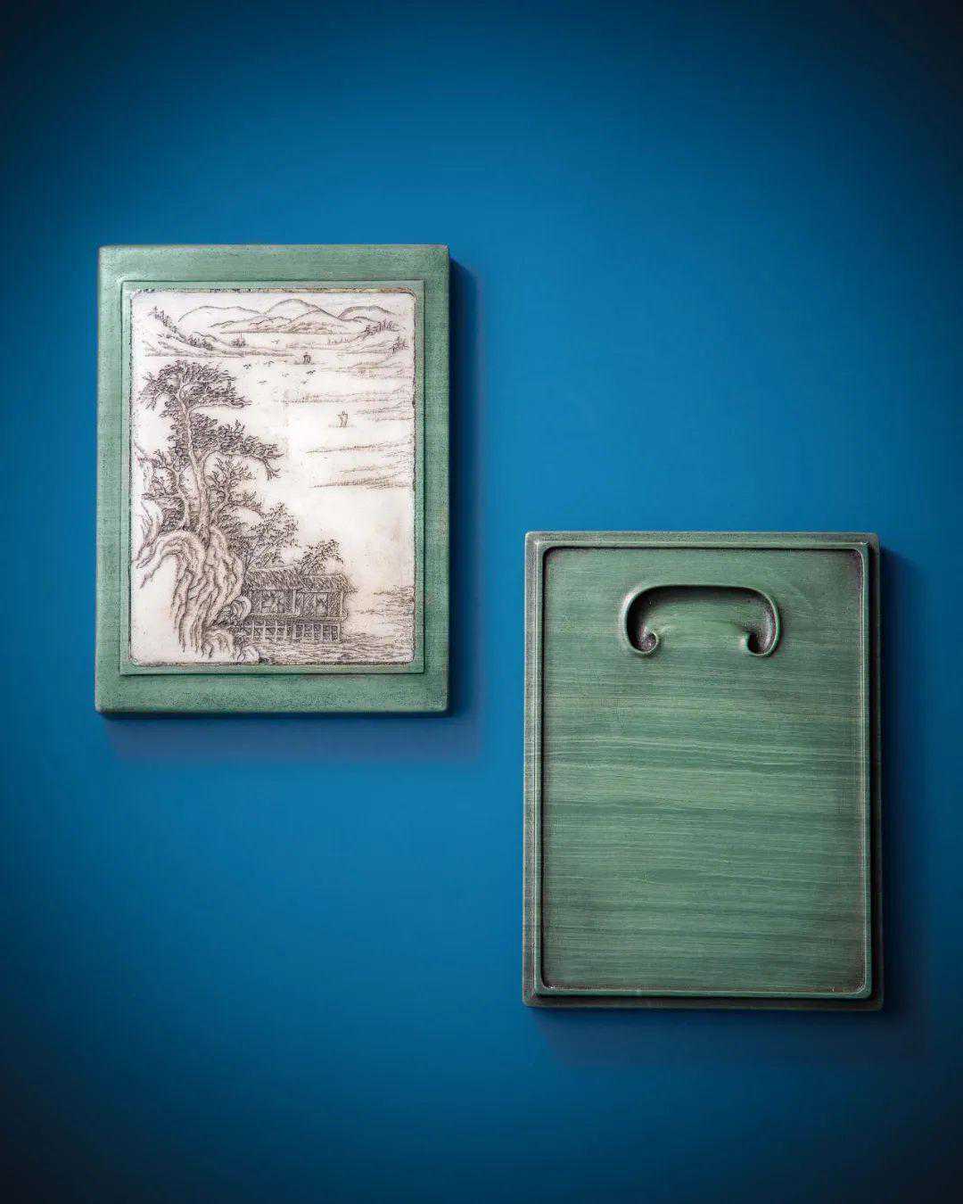 松花石又名松花玉,因产于清王朝的发祥地长白山区的江河之畔,故在清代备受重视。此砚松花石制,其石质坚硬而温润细腻,色呈青碧,纹理如画,刚柔相间,扣之如钢之声,清脆悦耳。色呈深绿,间以嫩绿,具细微层里,绿色中间杂淡黄色私纹,石纹清晰分明,横白皱纹行云流水。器型端正,分上下两层,上为砚盖,砚面镶嵌大理石,刻画山水栩栩如生,下为砚台,砚面开如意形墨池,小巧素雅,制作古朴。砚背,阴刻背铭:“朴而质,纯而一。文士得之,如金如玉。涤生。”涤生为清末功臣曾国藩。整器雕刻刀法简洁流畅,圆润无锋,加之其材质精良,刻工纯熟,可谓文房佳器。