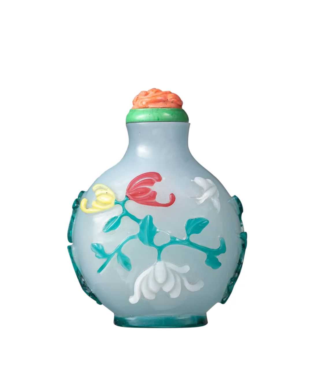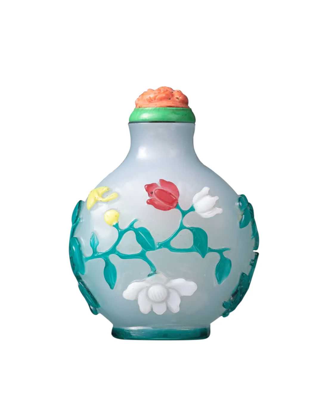 壶通体乳白色不透明玻璃为地,套红、黄、绿、乳白、白,呈现花卉与蝴蝶纹饰,纹饰花卉、蝴蝶构图与套料颜色呼应极为生动。玻璃套料出现于康熙时期,工匠运用套料的特性,将色彩结合产生精致绚丽的鼻烟壶,至乾隆时期已达高超的水平,传世相对稀少。