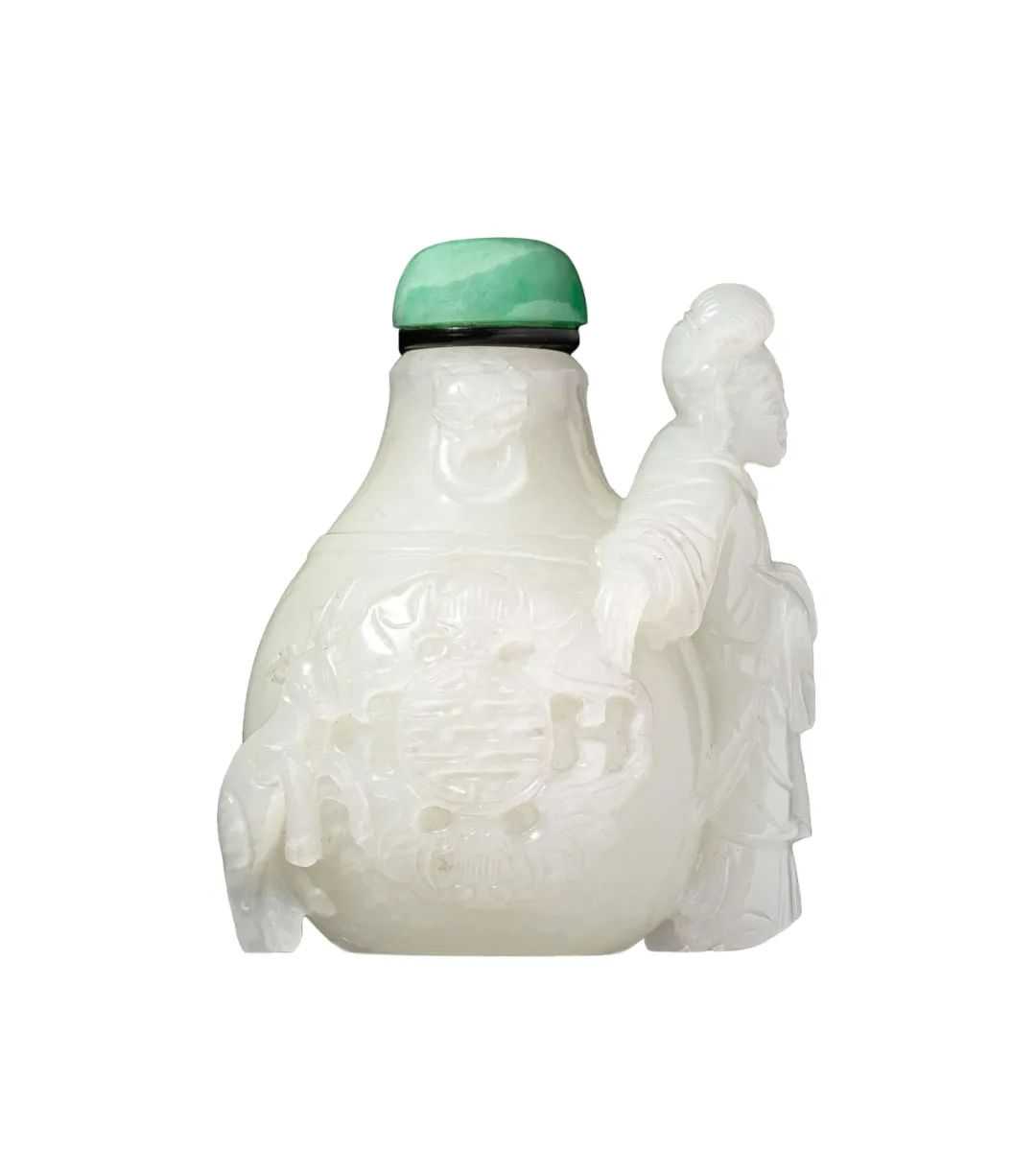 白玉的鼻烟壶虽多,但立体人物雕件少之又少,此壶白玉材质,溜肩,圆鼓腹,浅圈足,整体造型特别雅致,壶上浮雕兽首衔环,下方腹部浮雕蝙蝠,鹿,寿字纹,侧面立体雕人物麻姑,题材吉祥美好,精雕细琢,尤为稀有。