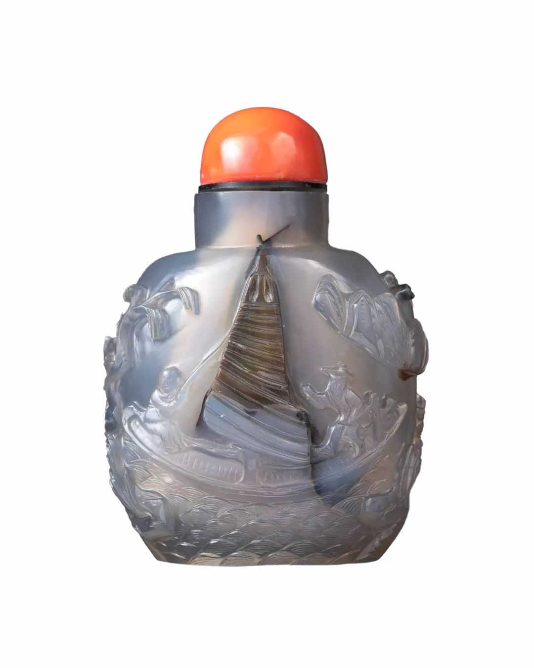 壶为玛瑙材质,扁圆壶体,直颈,丰肩,椭圆圈足,珊瑚盖顶。通体黑白虚实交错,雕工立体精湛,正面雕琢猫、蝶、花卉、山石,蜻蜓,猫同「耄」,蝶同「耋」,在中国画中,猫蝶图有长寿吉祥寓意,着以谐音取「耄耋」之寿的美好含义。另一面雕琢游船人物图,景中河流水纹层次鲜明生动,人物雕琢立体神采飞扬。