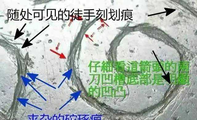线痕形态粗糙,边沿多出岐如毛刺,由很多细如发丝的不规则细线纹组成,风格粗放。
