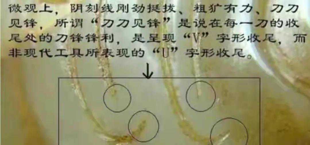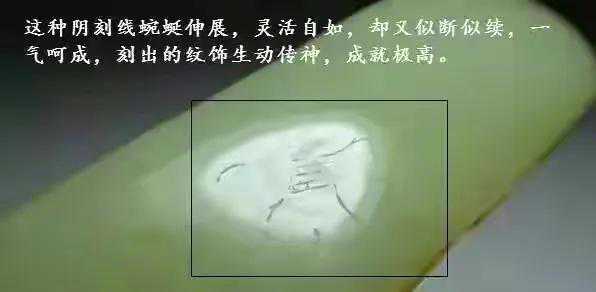 这种细阴刻线,应是用一种非常尖细而坚硬的器物在玉器上雕刻,若用力不均会出现叉道,或"若断若续"的跳刀现象。