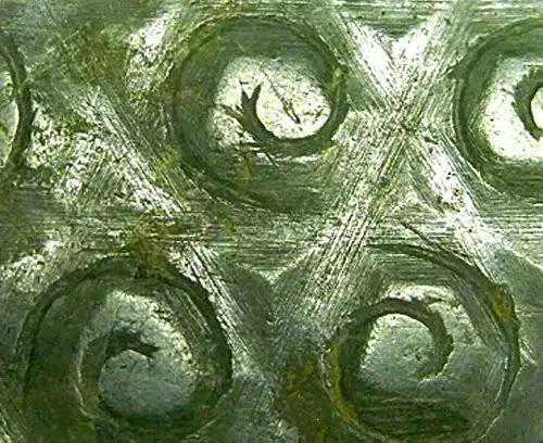 主要表现在矩形绹索纹、网格纹以填补浮雕图案的空白处,工艺痕迹极其细微,相互似连非连的浅细阴刻线。