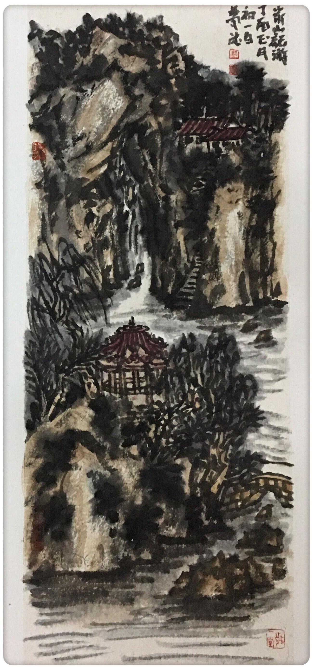 群峰耸峻、层峦叠嶂、深谷幽涧、飞泉奔流、苍松古木、云飞雾绕是梦德画中常出现的内容,这也是他心中的桃花源,他梦中的家山。他的构图继承了王蒙深邃繁密的特点,宋代画家郭熙在《林泉高致》中曾首先提出了“三远法”。梦德在画中主要通过对深远的营造来达成繁密幽深的效果。通常从前