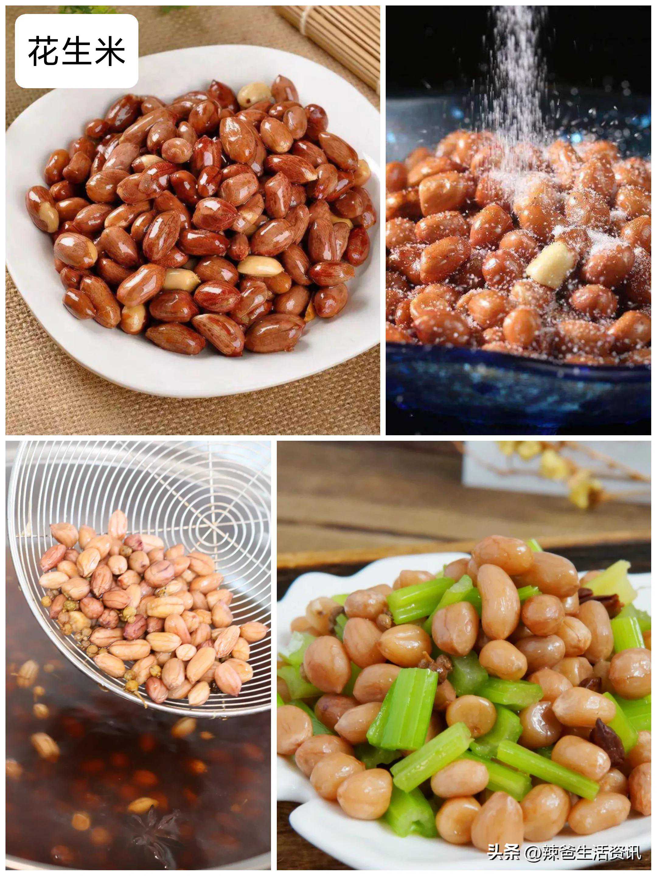 ①、水煮花生:花生洗净入锅,加水、盐、八角、桂皮、香叶,大火煮开转小火煮30分钟,关火浸泡3小时即可。