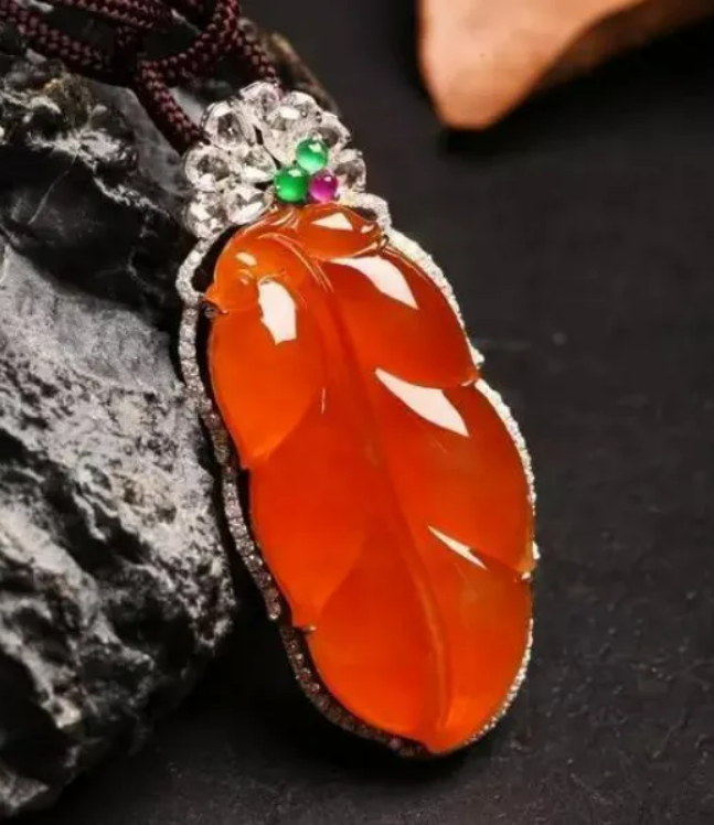 红翡又称红色翡翠,含有较高的微量元素铁,以褐色为主,褐中泛红的翡翠称为红翡,以红色为主,红中显褐的翡翠称为翡红。红翡的颜色是在硬玉晶体形成后形成的,是由褐铁矿浸染引起的,具有鲜红色或深红色的特点,好的红翡色泽鲜艳,质地细腻,非常美观,深受人们喜爱。