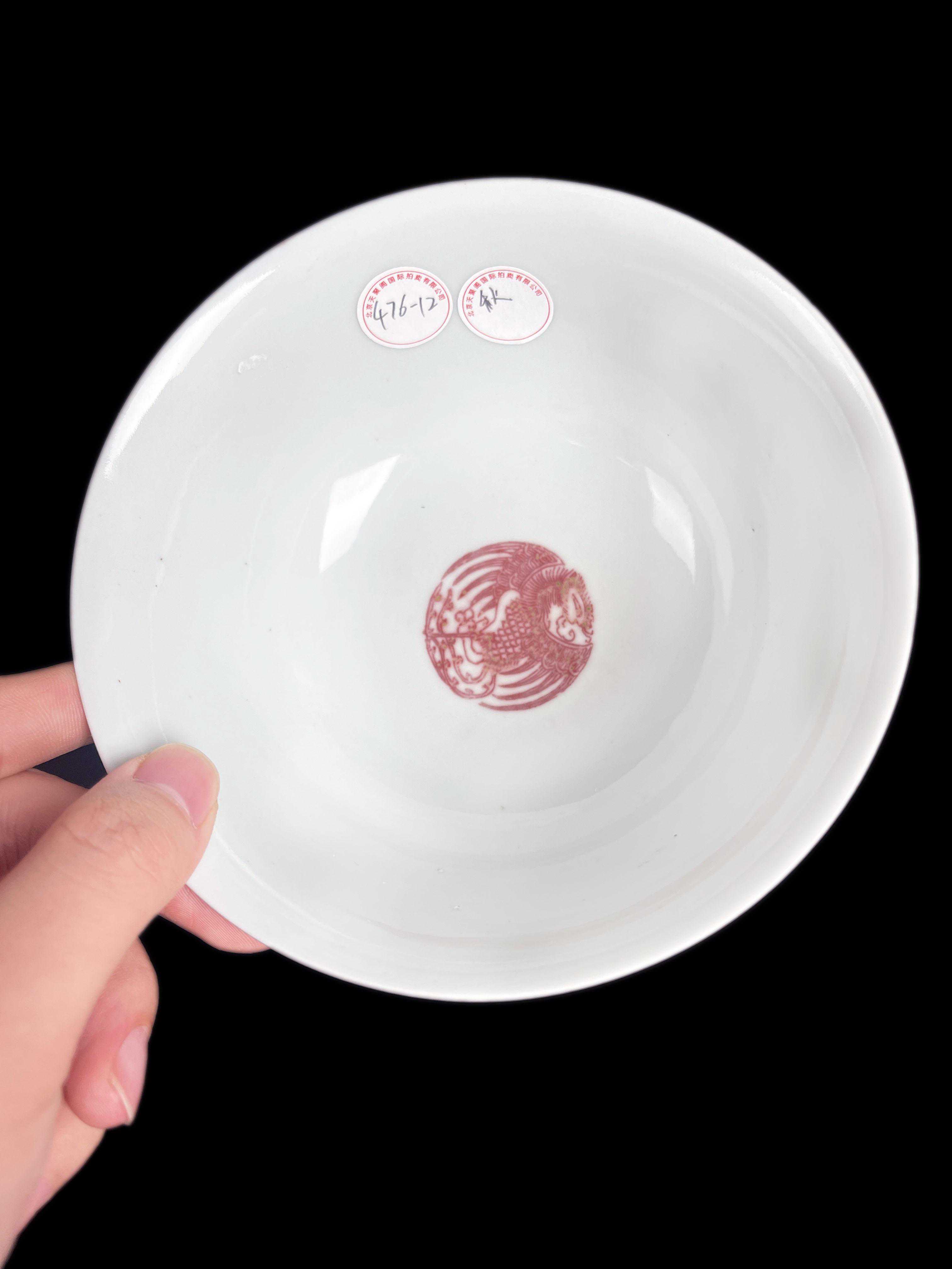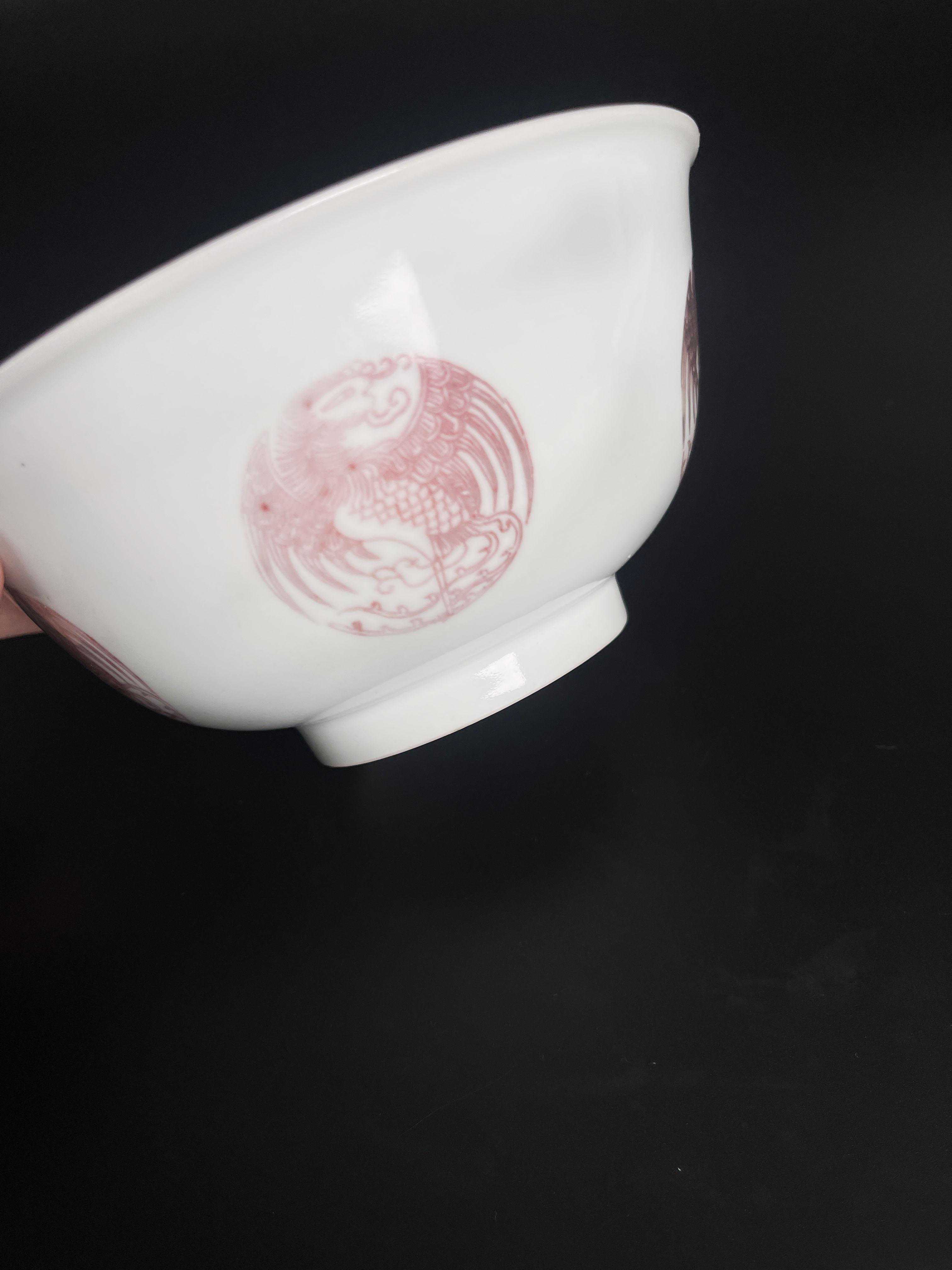 碗外壁以釉里红绘五只团凤,纹饰清晰,布局简洁,绘制精细,釉里红发色清晰艳丽,鲜红的团凤纹映衬在雪白的底色形成鲜明对比,具有极强的装饰性与观赏性。底部以青花书「大清道光年制」六字叁行篆书款,是清道光官窑上品。