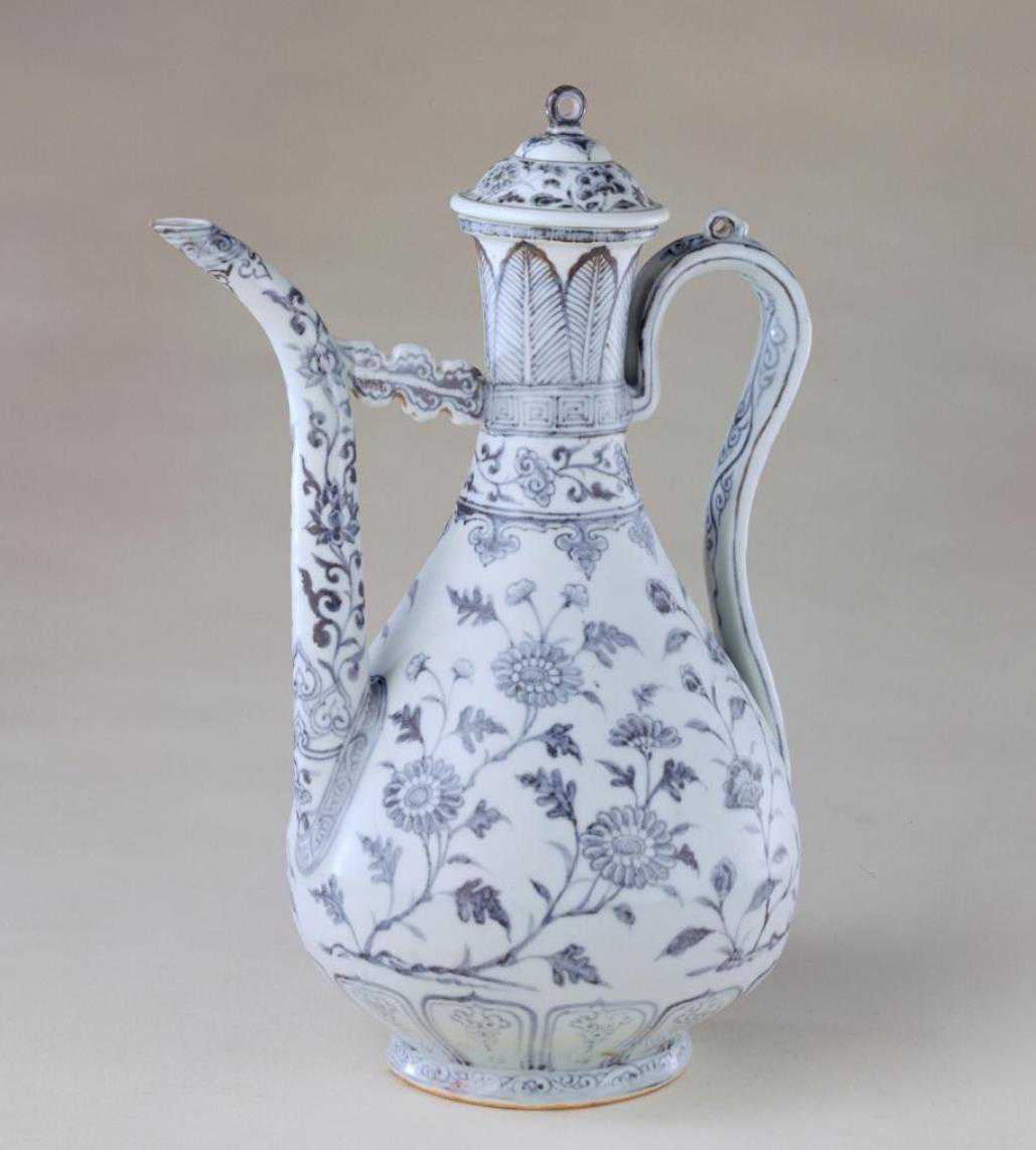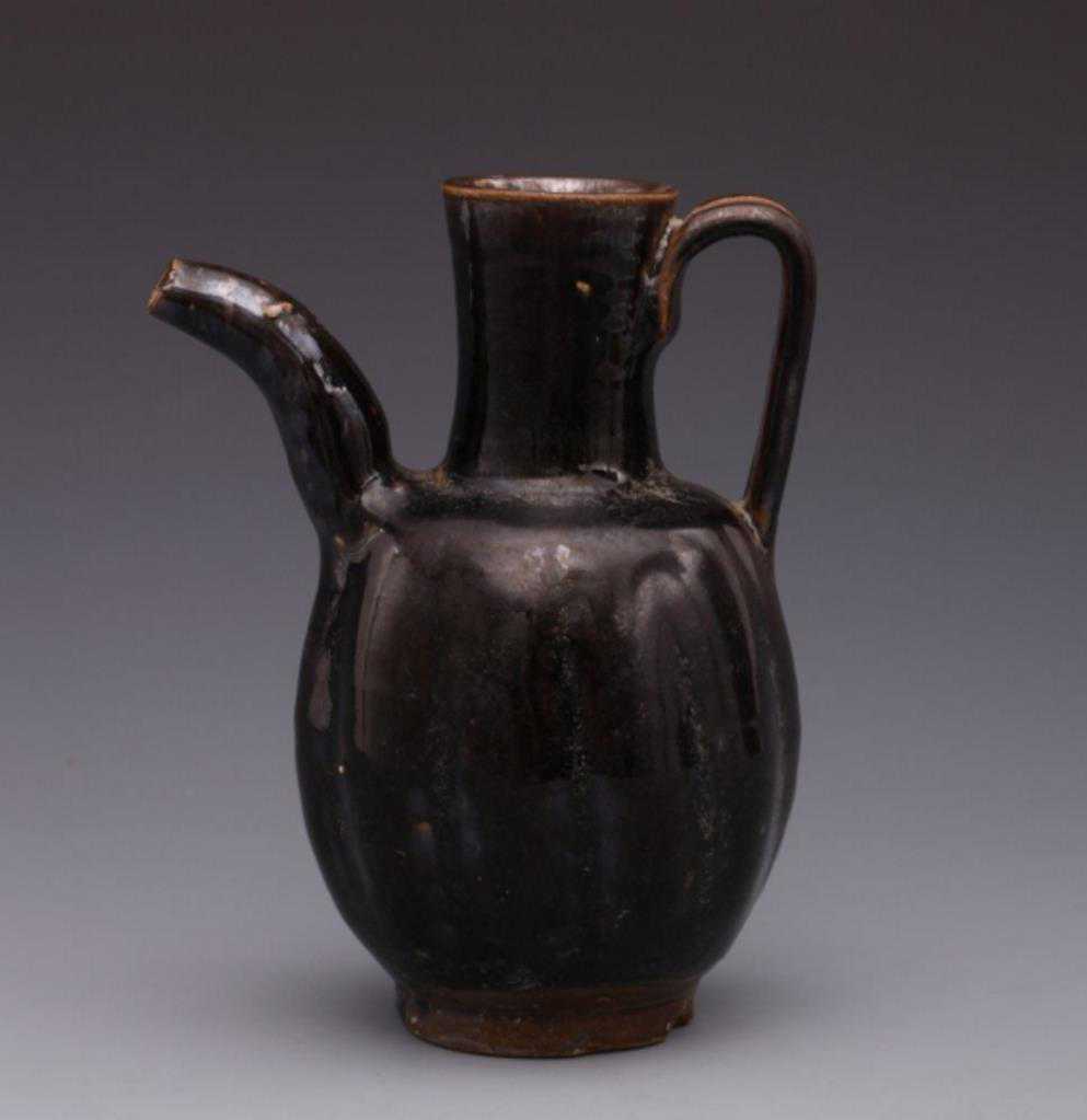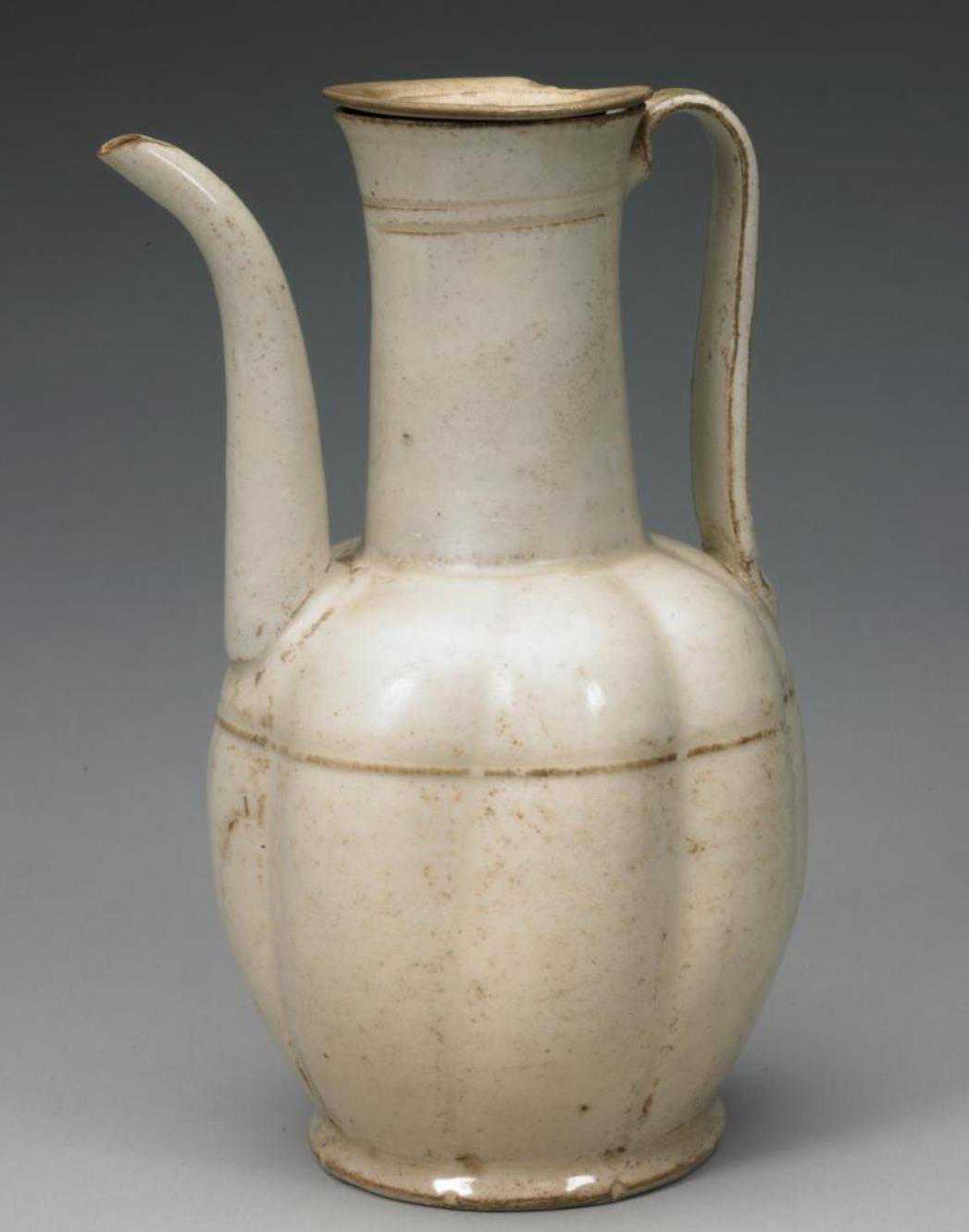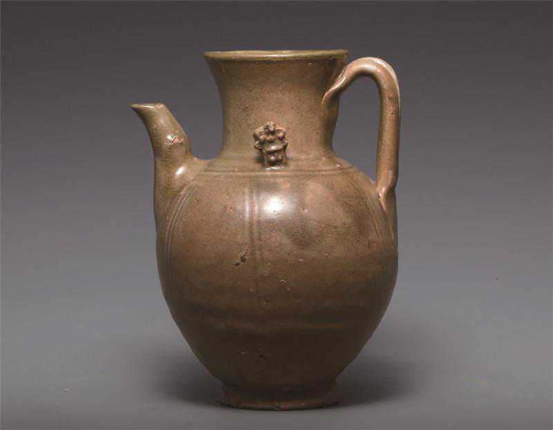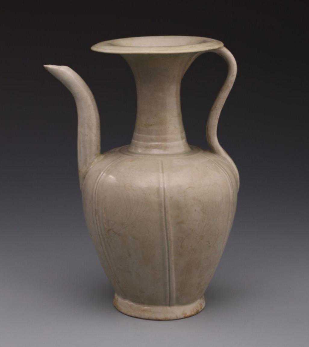 执壶最初的造型是由青铜器而来,南北朝早期的青瓷当中,已经完成了这种执壶的造型。其后在唐宋两代是金银器中的一种酒具,这从唐宋绘画上是很容易看到的。直到现在,还有宋代青白瓷的执壶流传下来。