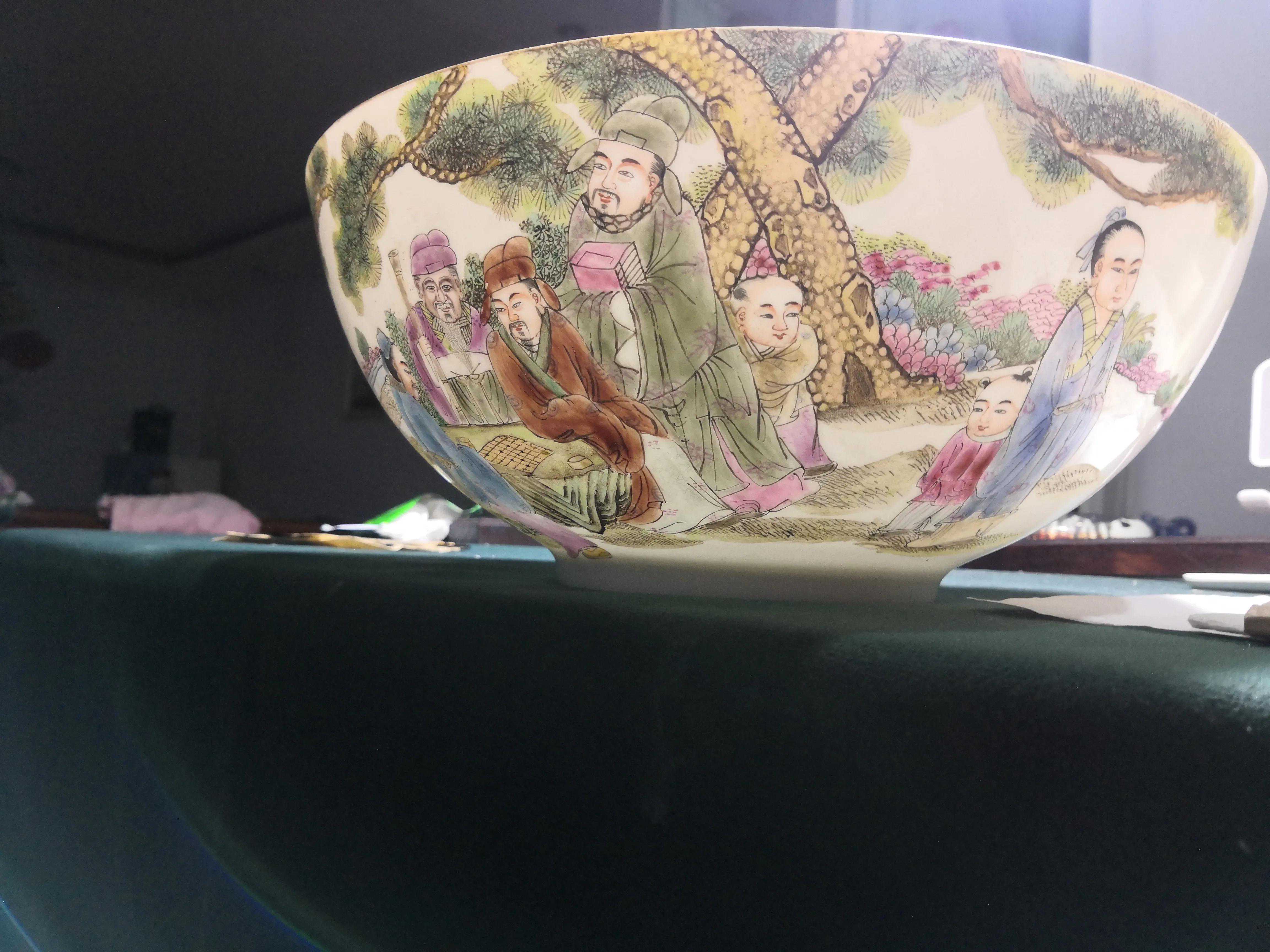 该碗薄如纸,比如胎薄体轻、色灌浆胎,底部棱角,圈足圆滑且弧度较宽、规整、均匀,硬度低等。景德镇传统的全手的薄胎在利胚上,全凭耳听手模的经验来判断,把2-3毫米的胚修到蛋壳一般,经高温而不变形。
