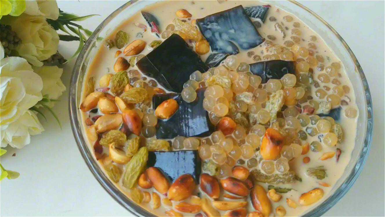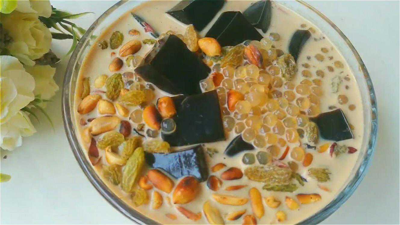 黑凉粉30克,糖适量,西米适量,茶适量,纯牛奶1瓶,花生葡萄干