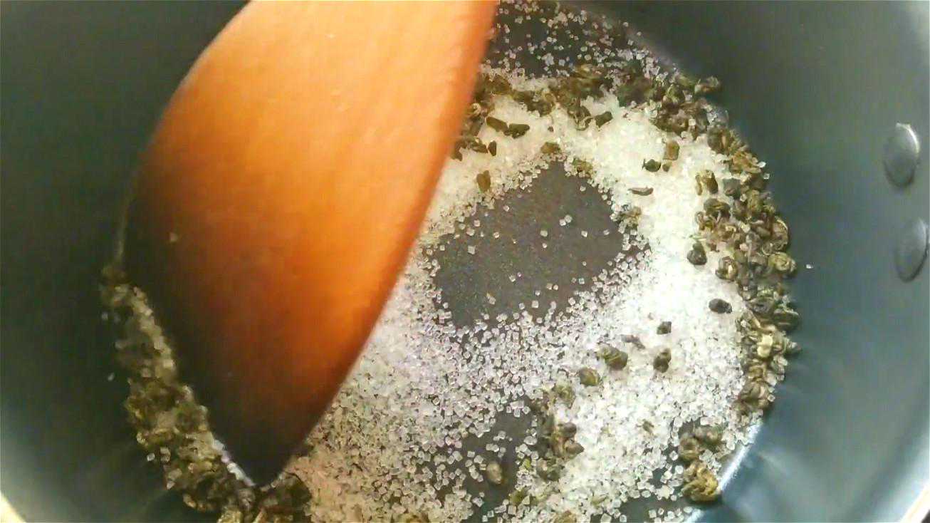 2,将三碗半的水倒入锅中煮沸。加糖(见喜欢的甜味),然后将溶于水的凉粉加到沸水中。