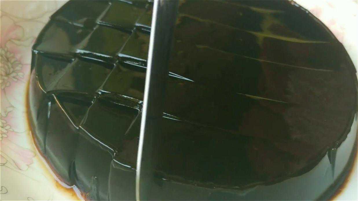 11,这个果冻也凝固成块,将凉粉倒入干净的盘子中,然后将其切成他喜欢的块。