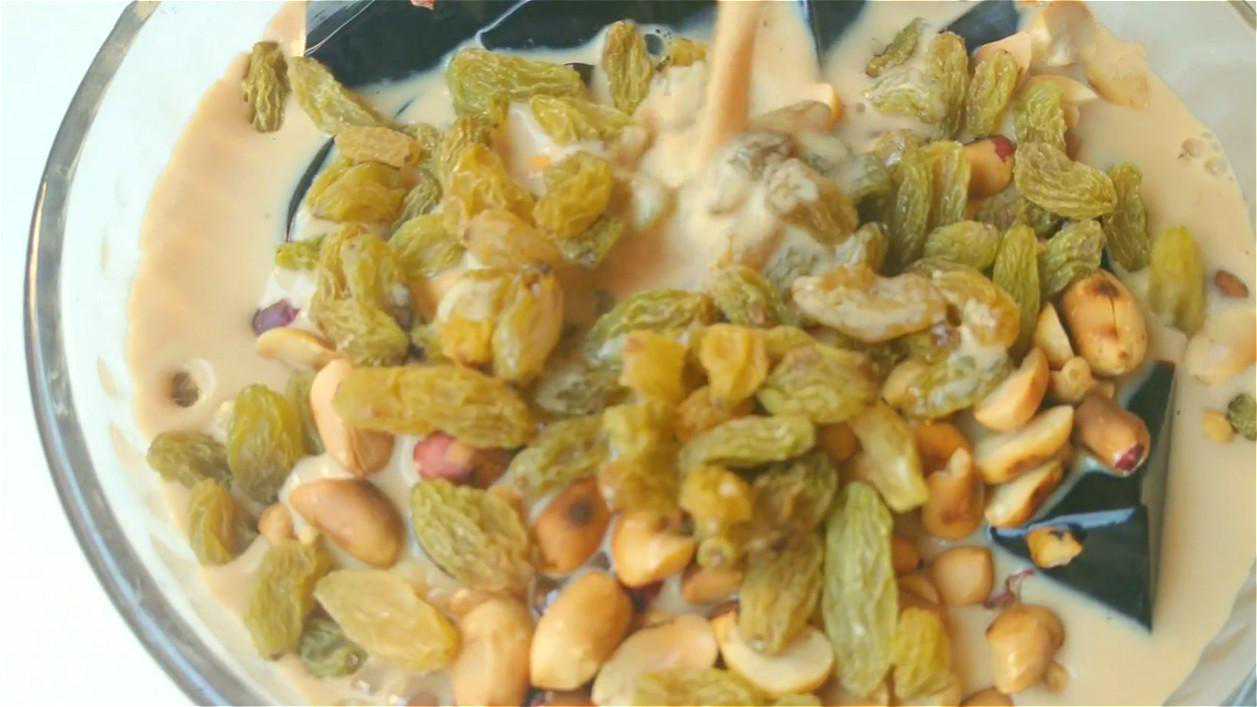 12,切碎并将其放入装有西米的碗中,然后加入花生和干果,最后加入准备好的奶茶。