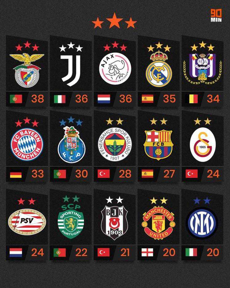 就在刚刚,国外媒体90min就统计了一份欧洲联赛,各大俱乐部的夺冠次数排行榜。排在第1位的是葡超豪门本菲卡,作为这个联赛真正意义上的统治者。本菲卡曾38次夺得葡超冠军,这让他们成为了欧洲联赛冠军最多的球队。排在第2位的是尤文图斯,他们拿到了36个意甲冠军。尤文是意甲第1支绣上两星,并且也是第1支绣上三星的球队。如果不是近几年球队战绩拉胯的话,他们现在甚至非常接近绣上4颗星。期待尤文图斯能够在接下来拿出好的表现。
