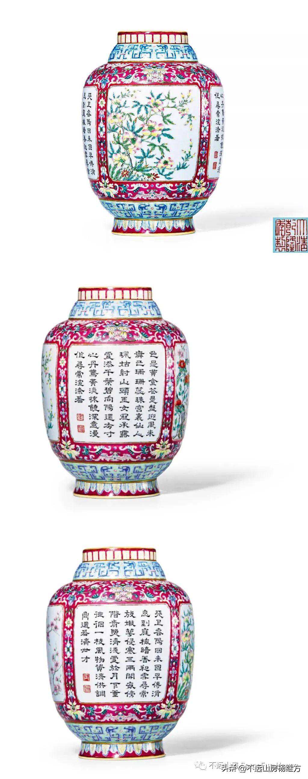 北京羿趣2021春的乾隆胭脂红地粉彩开光折枝花卉纹御题诗罐