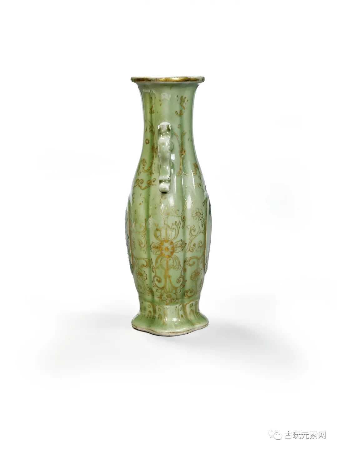 |清乾隆·青釉描金粉彩灵鹿纹兽耳瓶|