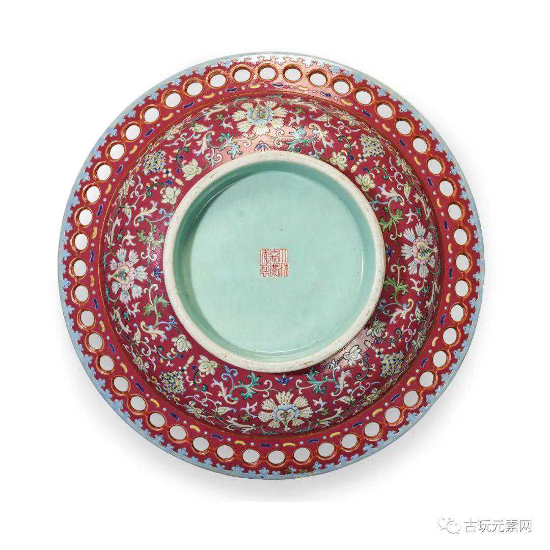 |清嘉庆·胭脂紫地粉彩蕃莲纹镂空折沿供盘|