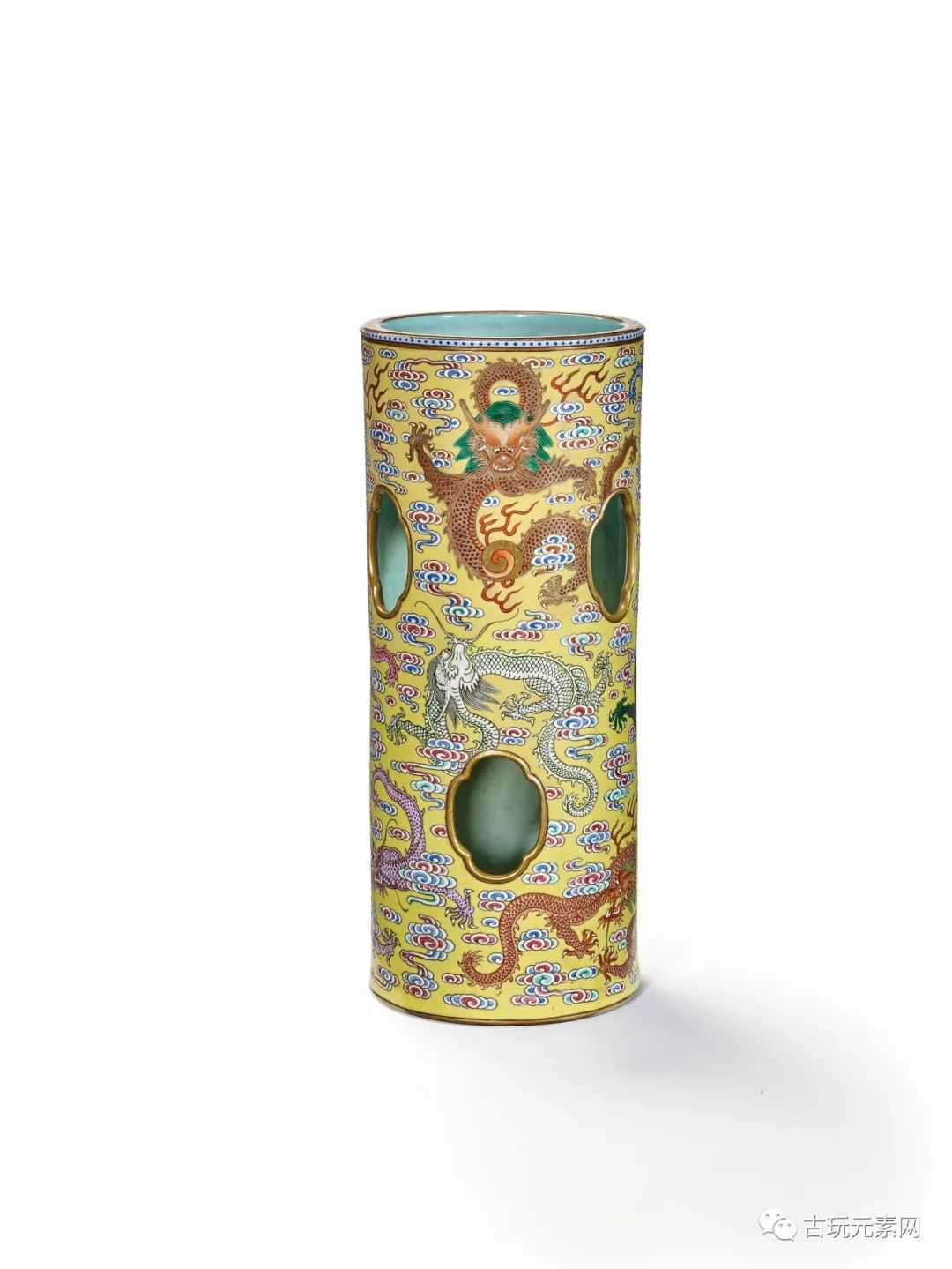 |清嘉庆·黄地洋彩描金云龙纹帽筒|