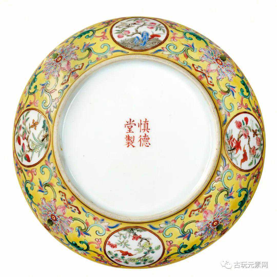|清道光·粉彩黄地缠枝莲纹暗八仙纹盘一对|