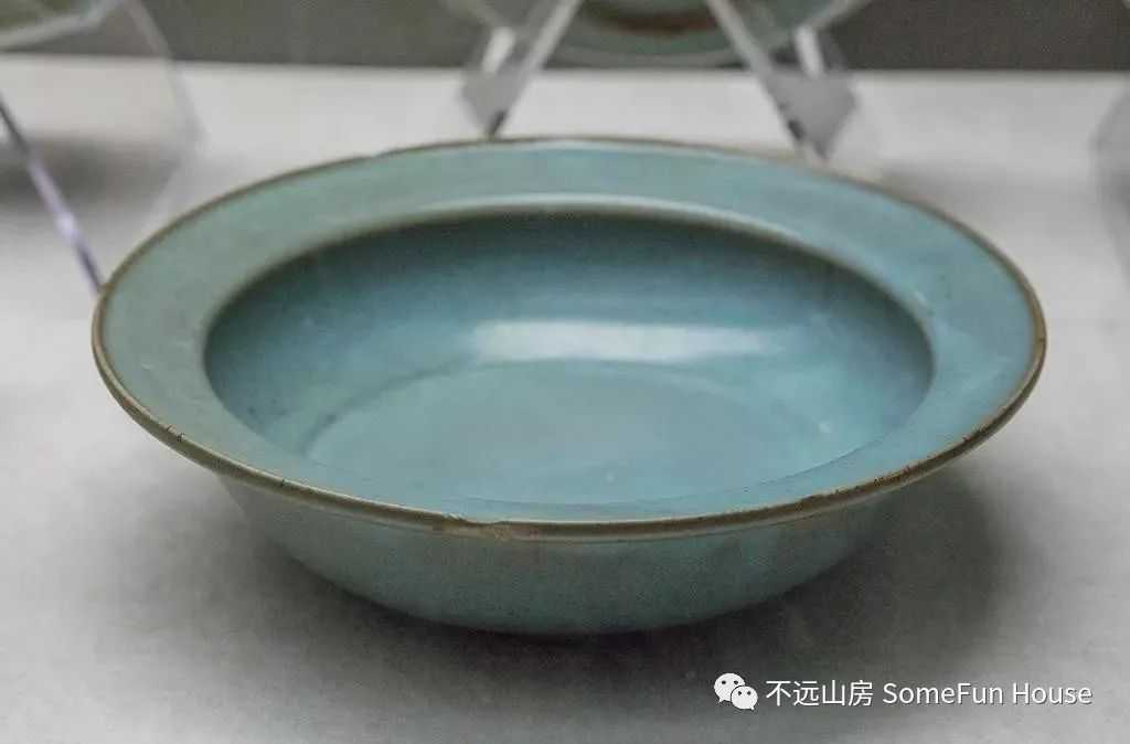 河南博物院藏金代钧窑天蓝釉圆洗,金代,高7.2厘米,口径27.7厘米,足径18.5厘米,1978年长葛石固窖藏出土。圆唇,浅曲腹,大环形矮圈足,底部有五枚支钉痕,布局不甚匀称。通体施天蓝釉,匀净光润,有稀疏的小棕眼,口沿釉较薄,呈黄绿色,器表釉层较厚,有流釉现象,足端露胎部施棕黄色护胎釉。