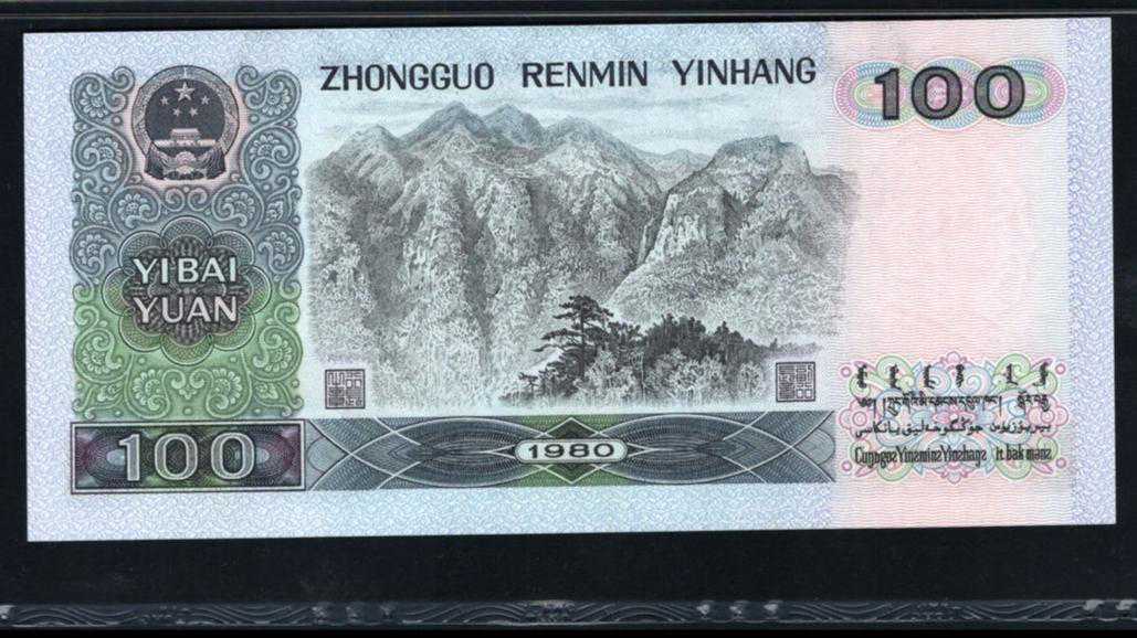 大家好,我是小李。1980版100元发行于1988年5月10日,是属于我国第四套人民币。80版100元采用双凹印刷工艺,二字冠、八号码,票面尺寸165x77mm。正面主图案为毛泽东、周恩来、刘少奇、朱德四大伟人画像,主要颜色为蓝黑色;背面主图案为国徽和井冈山主峰,颜色为蓝黑色,毛泽东侧面头像固定水印。
