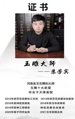 为了追求玉雕艺术的完美,向更加完美的艺术空间发展,苏芳宾又前往苏州、广州、北京、云南等地向各个大家、名家大师学习。自2011年开始跟随玉雕名家苏明奇学习后,2014年又进入吴春强玉雕大师工作室继续深造,2016年在朋友的支持下成立了“白玉世家”玉石雕刻工作室。在不断的努力下2019年苏芳宾被评定为河南省镇平县玉雕十大玉雕新星,2020年又被评定为河南省玉石雕刻大师,2021年毕业于天津美术学院。