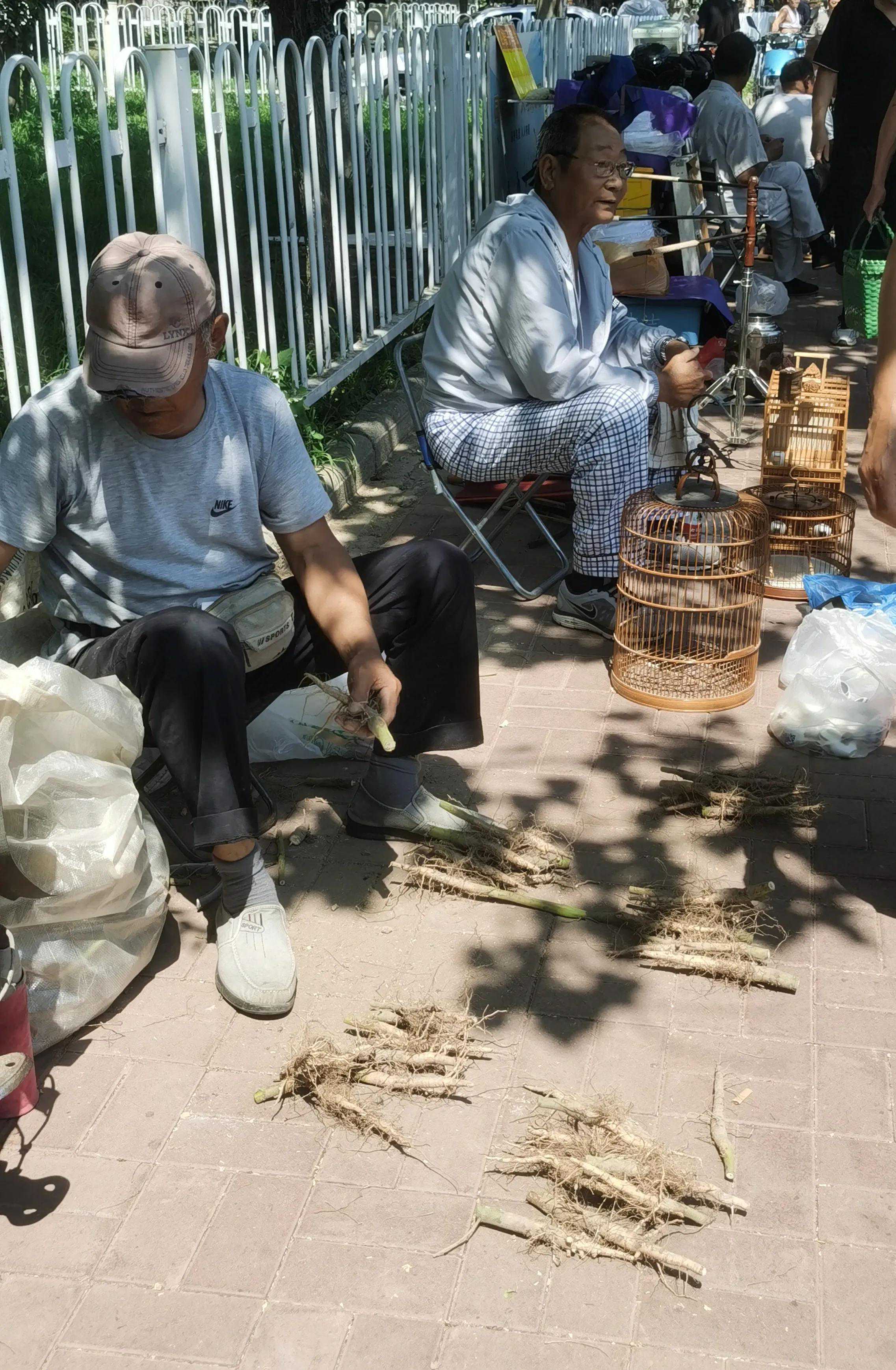 您看,这地上摆放的,一小堆一小堆的植物根部,也是卖给养鸟人的,您猜猜,有什么用?