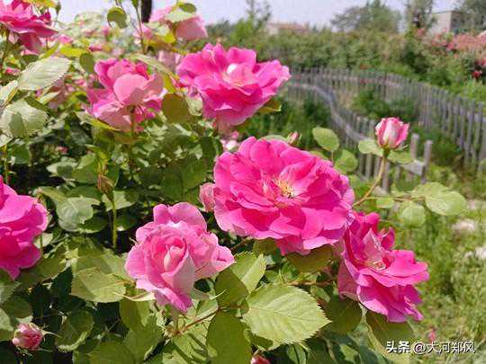 农忙闲暇时光,不时有村民漫步花间,赏花拍照,旁边原木色小木屋在月季花的映衬下,别有一番风情,村民或赏花聊天,或享受微风,非常惬意。
