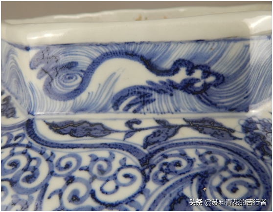 口沿处的波涛海水纹使用元青花特有的铁线描技法,肉眼可见线上有明显的浓点,又叫串珠纹。这是元青花的特有现象,到永宣时期,这一现象便逐渐消失不见。