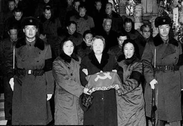 1976年1月14日傍晚,邓颖超手捧周恩来的骨灰盒走出劳动人民文化宫
