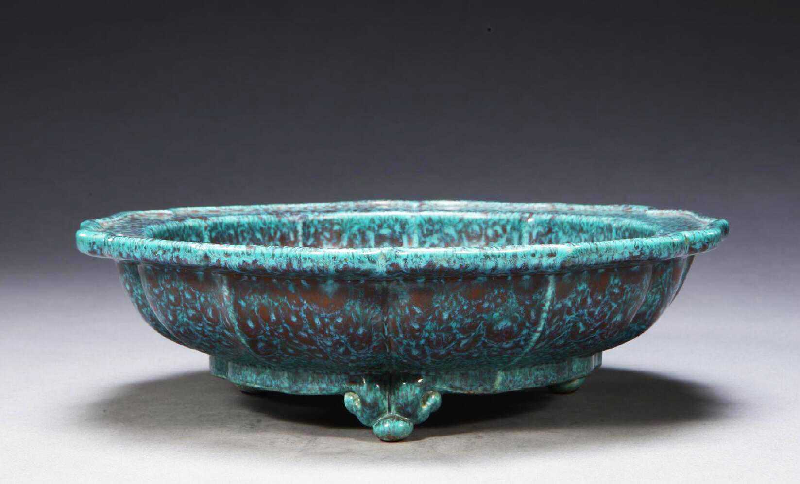 花盆托呈六瓣菱花式,折沿,浅弧腹,里心平坦,内壁出筋12道,底下承以三足,外底暗刻篆书“大清雍正年制”六字三行款。通体施炉钧釉,釉色以蓝色为主,其间密布星星点点的红、青色斑点,具有变化万千的自然之美。