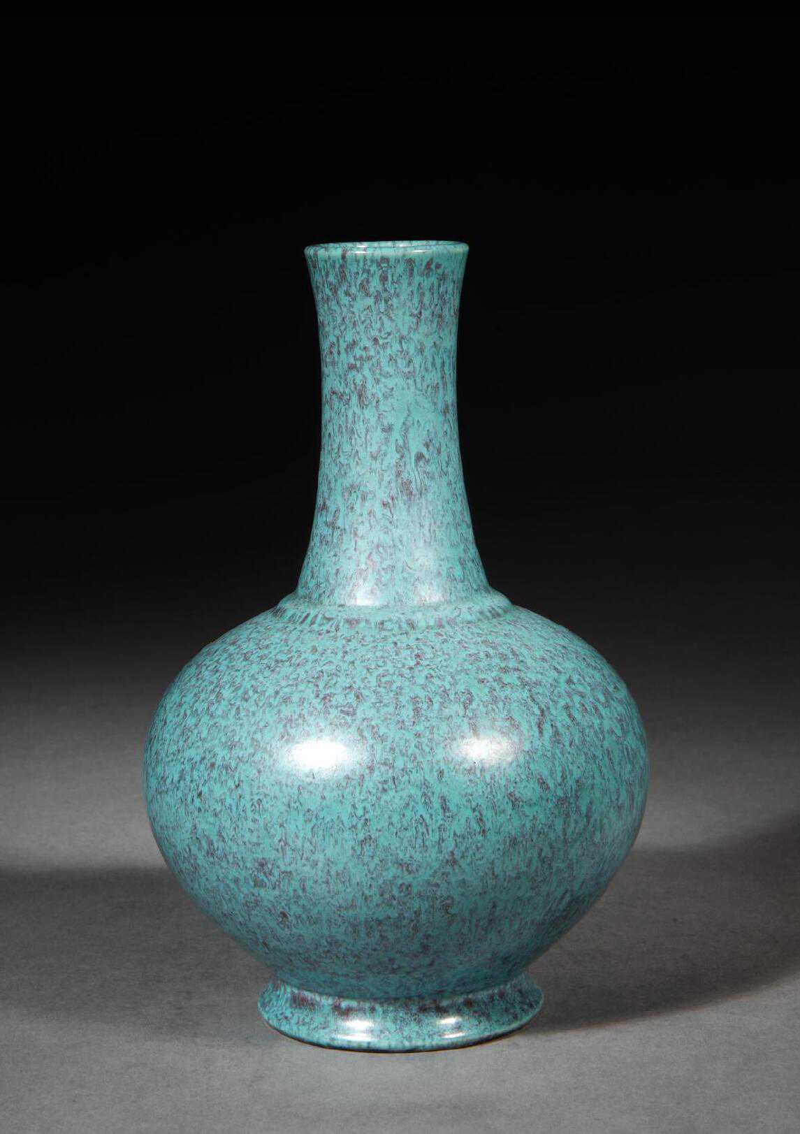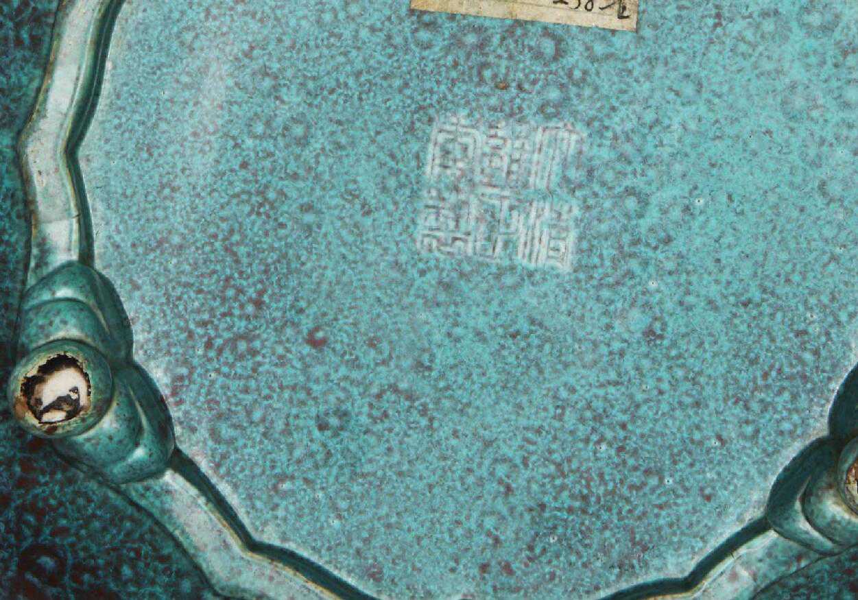 在釉面密布蓝、绿相间的麻点纹,此种炉钧釉被称为素炉钧。它是在素坯上吹以翡翠色底釉(以氧化铜着色的粉彩颜料),再在面上吹以广翠色釉(以氧化钴着色的粉彩颜料),两种色釉经过窑火烧炼,相互交融,在釉表形成深浅、长短不一的垂流条纹,有的弯曲,有的垂直。由于釉中含有粉剂,故釉层厚而不透明。