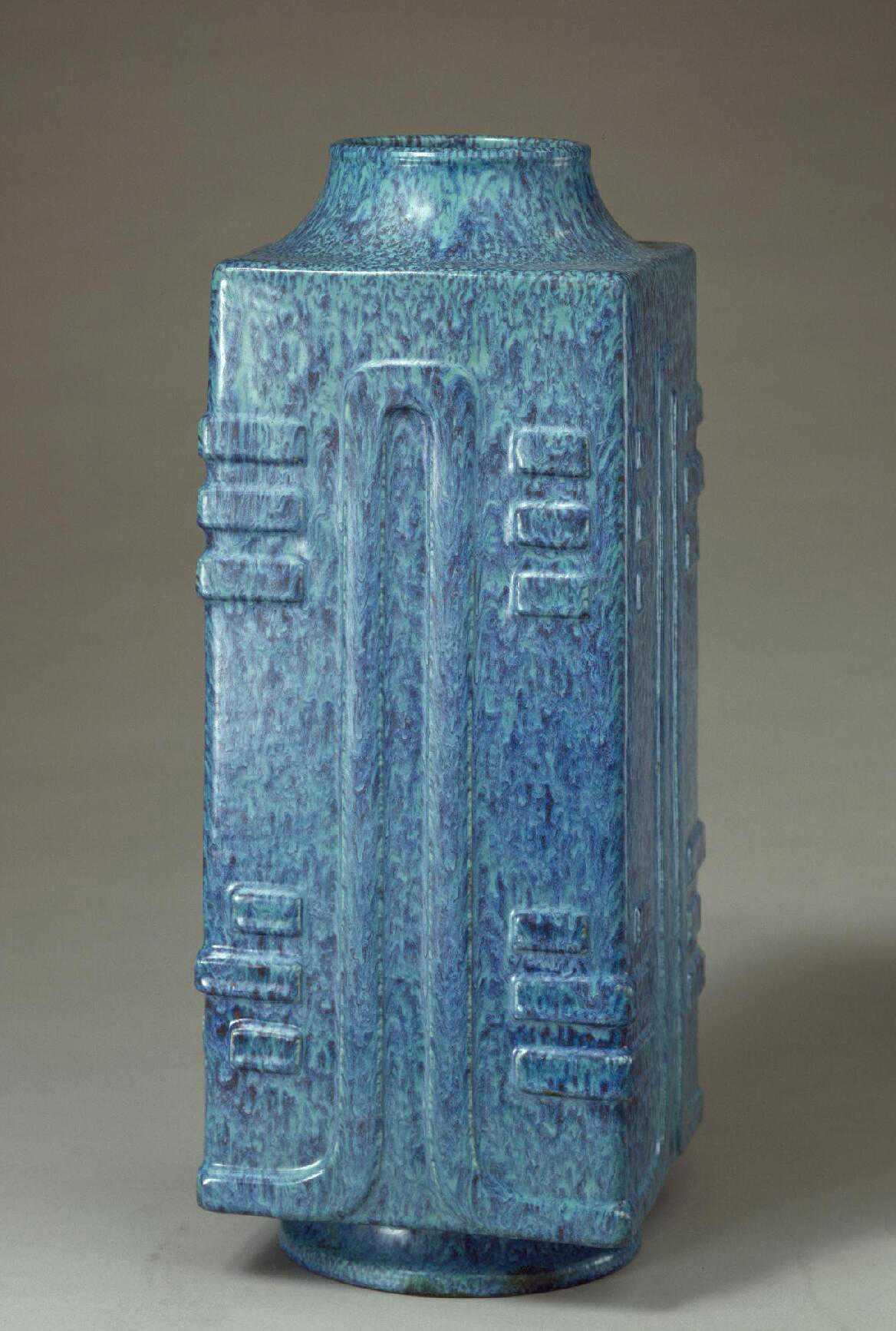 清乾隆炉钧釉琮式瓶瓶仿玉琮造型,小口,短颈,折肩,方腹,高圈足外撇。器腹折角处凸饰八卦纹。通体施炉钧釉,釉面蓝紫相间,色彩斑驳,外底署阴刻篆书“大清乾隆年制”三行六字款。