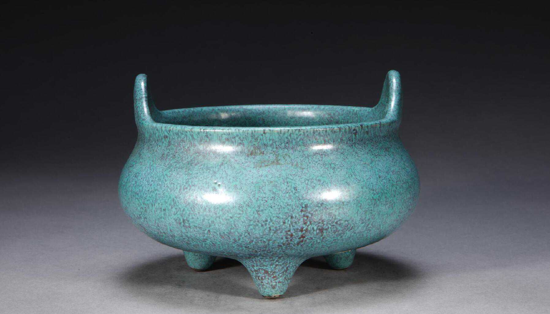 清乾隆炉钧釉双耳三足炉炉直口,口两侧对称置环形耳,短颈,扁圆腹,底下承以三个锥形足。外底刻划篆体“大清乾隆年制”六字三行款。内外施炉钧釉。
