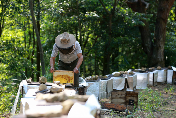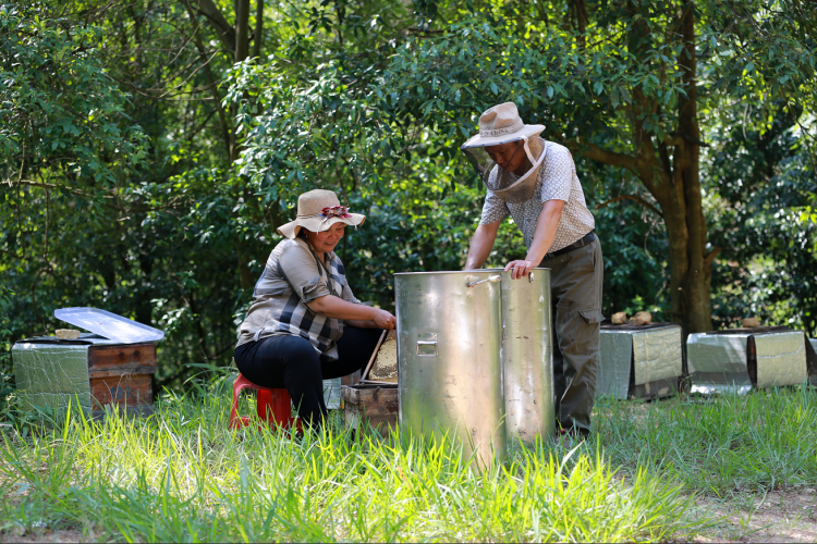 经过一个多小时的爬山颠簸,来到了海拔近千米的笔架山一处深山沟里。还未见养蜂人,先听见蜜蜂“嗡嗡”纷飞的声音。放眼望去,只见一排排蜂箱摆放在山间道路旁,空气中飘来阵阵花香,养蜂人覃兆平正在和他的妻子一起忙着摇蜜。