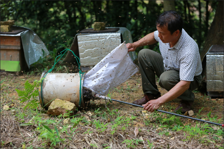 覃兆平收取分出来的蜜蜂。