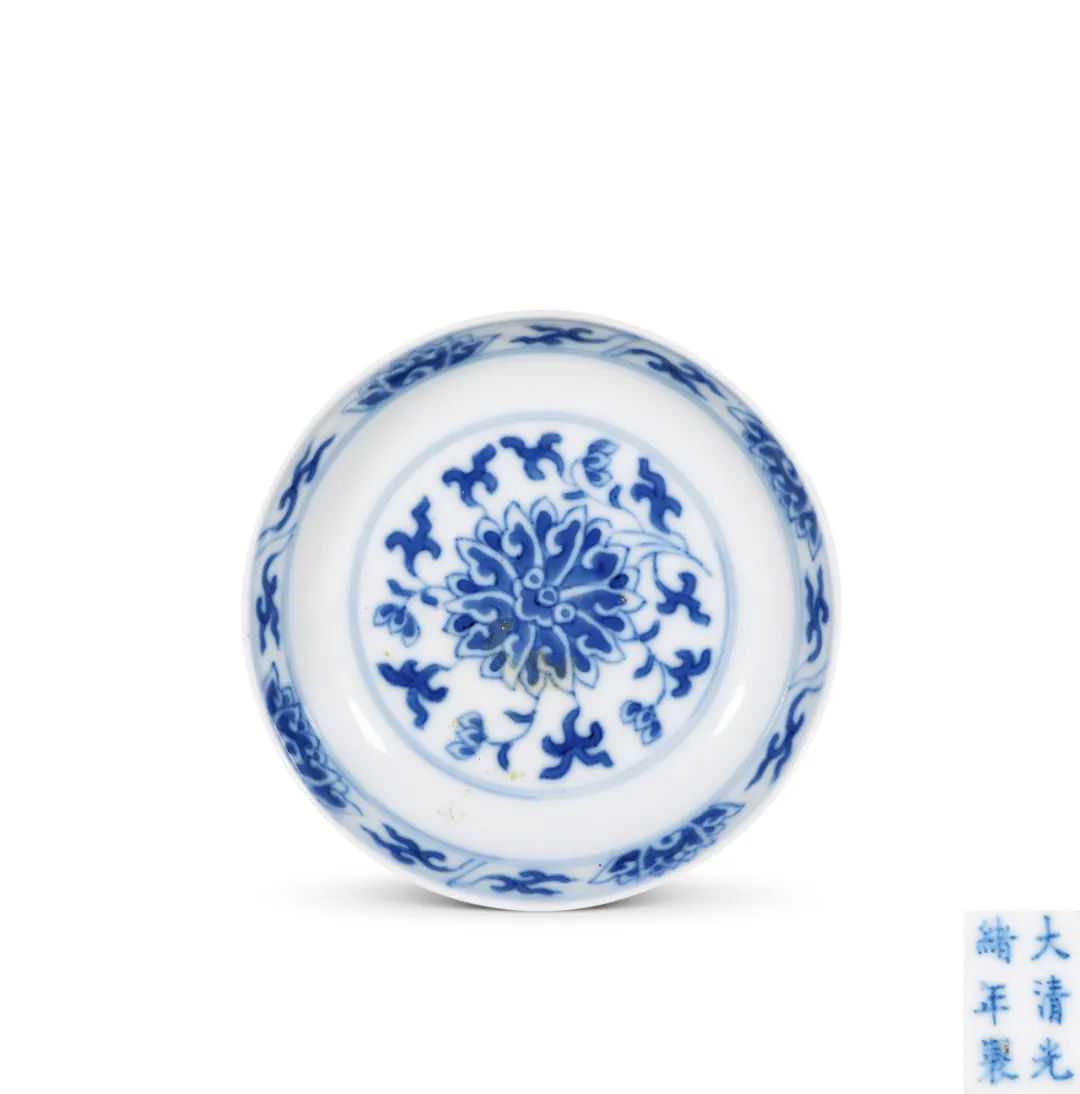 说明:此件拍品为清代御窑传统制式,器型规整,胎质细腻坚硬,盘心绘西番莲花,边饰及盘外壁皆同。青花发色艳丽,构图舒朗有致,纹饰绘工流畅,为光绪朝烧造精美的青花作品。文物商店库出。