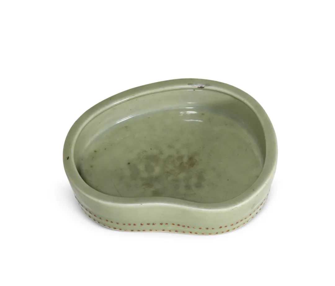 说明:“整体造型表现为一段很短的不规则的竹根,并用褐釉点饰"竹节须根"。它的底部内凹,形成平切的圈足,平底中间有四个支烧点,胎釉结合处稍有粘砂。这件水仙盆虽然无款,但是釉色莹润、工艺尚佳。流传有序,应该是乾隆官窑器物,P340頁。”