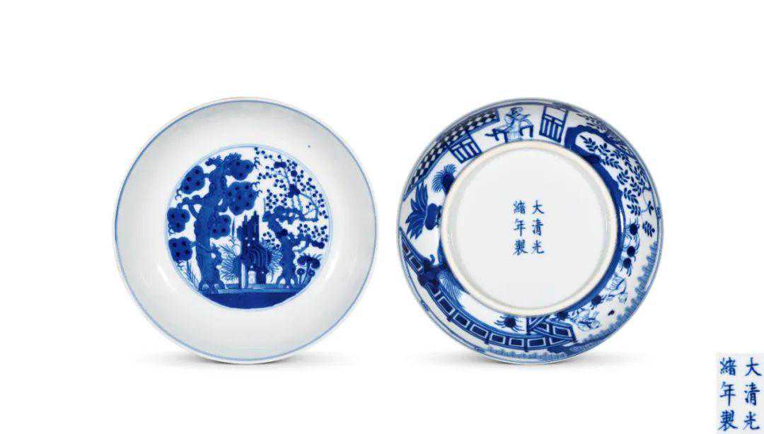 说明:敞口,丰腹,圈足。胎质细实,釉色润糯。口沿内青花双圈栏饰,盘心绘松、竹、梅岁寒三友,秀石、灵芝、小草饰以其间。盘外壁青花全景通绘庭院人物图景,石墙半栏,岸边垂柳,老树茂叶,卷云低拂,妇人中坐堂间,两童戏于花草丛中。绘笔规矩细致,图饰清朗悦目,青花发色醇雅,器形饱满丰圆。底部青花楷书“大清光绪年制”六字款